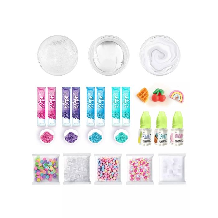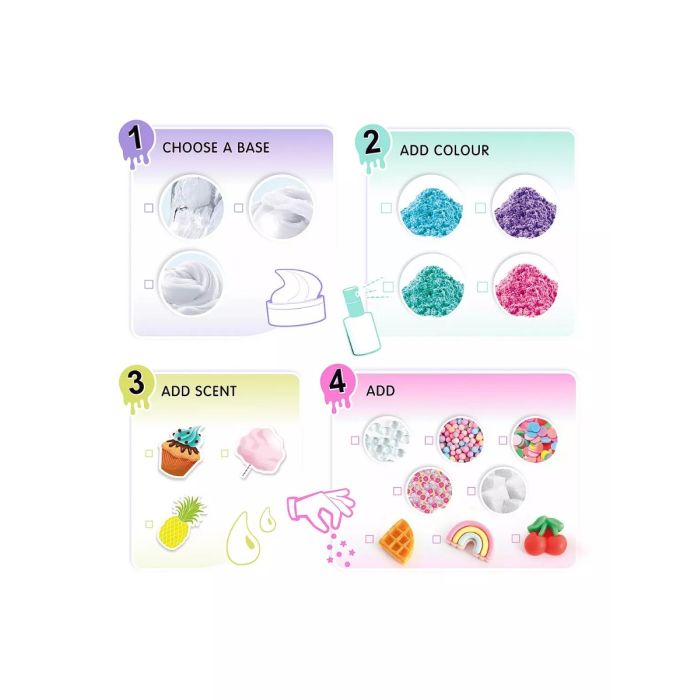 Deze complete set bevat alles wat je nodig hebt om je eigen slijm te maken en te personaliseren. Begin met het kiezen van je basis: kristalhelder, boterzacht of glanzend en plakkerig. Kies vervolgens uit vier levendige kleurstoffen om je slijm te kleuren en voeg heerlijke geuren toe, zodat je slijm net zo lekker ruikt als het eruitziet.