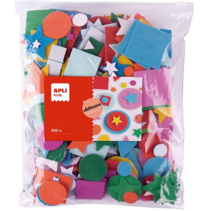 Verschillende vormen van EVA-schuim. Elke zak bevat 500 vormen, 4 van elk: ster, vierkant, cirkel en driehoek. Verschillende kleuren: geel, oranje, rood, roze, lavendel, hemelsblauw, donkerblauw, groen, grijsblauw, turquoiseblauw en pastelblauw. Verschill