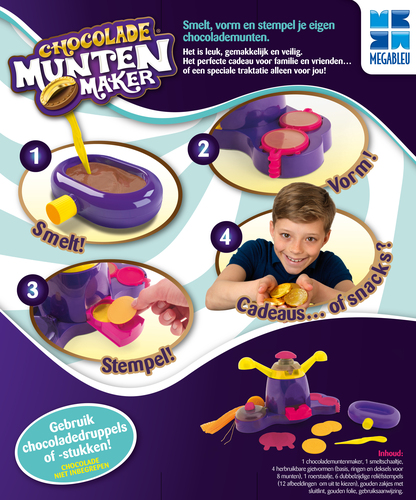 Maak je eigen chocolademunten met deze muntenmaker! Smelt de chocolade in het smeltschaaltje en doe hem in de gietvorm. Wanneer de chocolade gestold is, verpak je de munt in een mooie gouden folie. Kies daarna een reliëfstempel en gebruik de muntenmaker om een afdruk te maken op de chocolademunt.
