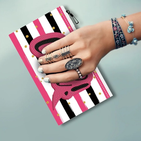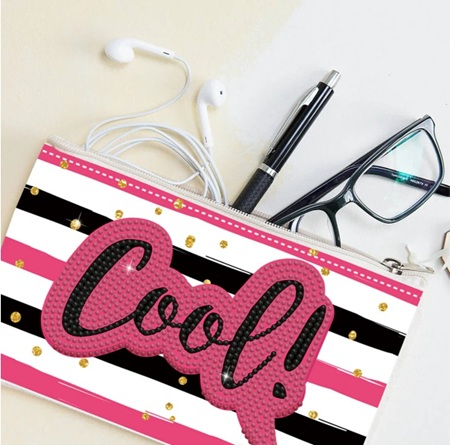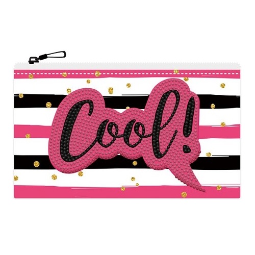 Houd je essentiële spullen sprankelend en stijlvol met het Diamond Dotz Cool Zipper Pouch! Deze levendige tas met diamantschildertechniek heeft een felroze tekstballonnetje met het woord “Cool!” op een achtergrond van opvallende zwart-wit-roze strepen en