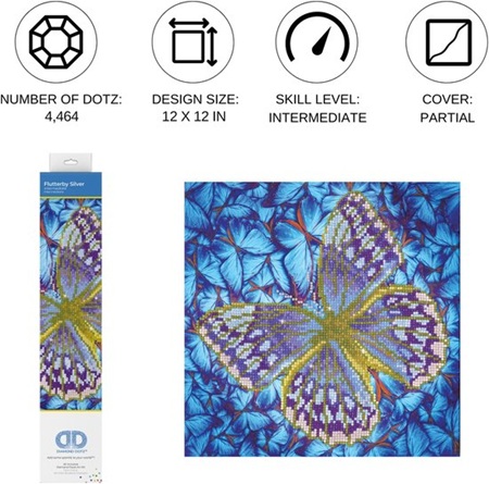 Geef je collectie een sprankelende twist met de Diamond Dotz Flutterby Silver – een majestueuze vlinder die lila, goud en zilvertinten combineert op een schitterende achtergrond van gelaagde blauwe vleugels. Deze set voor gevorderden, met gedeeltelijke dekking dankzij 4464 ronde diamantjes, is perfect om je knutseltijd een stijlvolle en elegante uitstraling te geven. Dit opvallende ontwerp is een echte blikvanger voor liefhebbers van diamantschildersets voor volwassenen en biedt een stralende variant op de klassieke vlinderdiamantkunst. Het is bovendien een perfect cadeau voor iedereen die van diamantschilderijen met vlinders houdt.