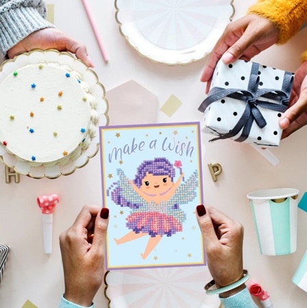 Voeg een vleugje magie toe aan je berichten met de Diamond Dotz Make A Wish wenskaart. Deze sprankelende doe-het-zelf-kaart, met een vrolijke fee die met haar toverstaf zwaait, is een charmante manier om iemand speciaal te verrassen. Ideaal voor zowel knutselaars als beginners, en een leuke optie voor fans van Diamond Painting Kits voor volwassenen, Diamond Art Kits en speelse wenskaarten met diamantkunst.