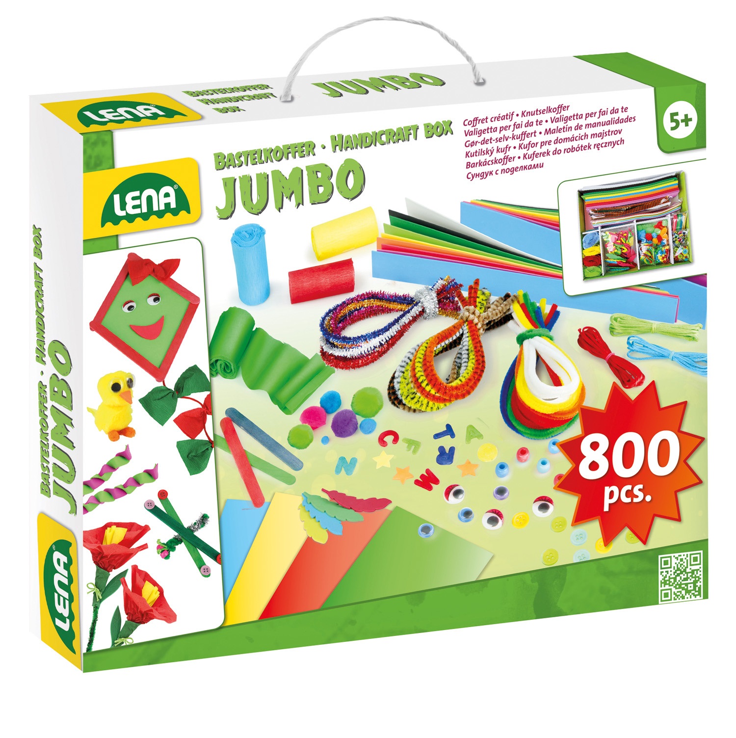 Lena Creatief Jumbo Knutselkoffer 800 onderdelen Deze Jumbo knutselkoffer bevat gekleurd papier, pijpenknoei, brilogen, pompons, glitterstenen, piepschuimballen, crêpetape, gekleurde ijsstokjes, sleutelhangers, papieren stickers, strooiklemmen en knope