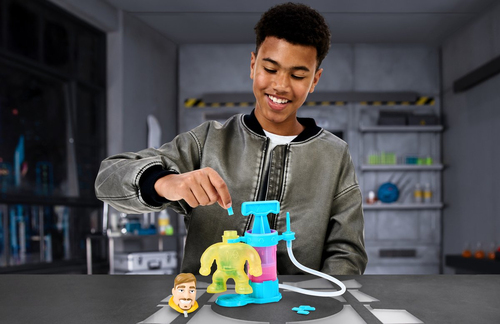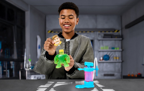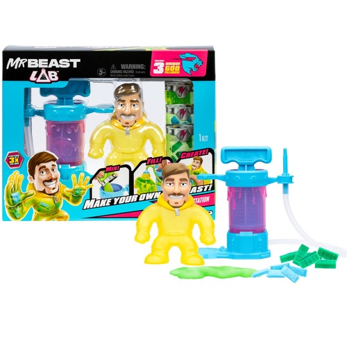 In het streng geheime deel van zijn lab is MrBeast begonnen aan een bijzonder experiment: het creëren van het ultieme rekbare figuur. Stap binnen in het MrBeast Lab Creation Station – dé plek waar jij je eigen MrBeast stretchy figuur tot leven wekt. Bevestig het MrBeast lijf aan de speciale Creatie-Kamer en vul hem met bijzondere ingrediënten: dollarbiljetten, Feastables-repen en groene slijm! Giet de groene slijm erin, voeg een beetje water toe en begin te pompen! Zie hoe MrBeast tot leven komt. Bevestig zijn hoofd en rek hem uit tot wel drie keer zijn formaat, knijp en druk erop en bewonder hoe de dollarbiljetten en Feastables-repen rondswirlen in zijn lichaam! Je kunt hem keer op keer opnieuw vullen, mixen en creëren! Met de MrBeast Lab Creation Station is elke creatie een avontuur op zich! Leeftijdsindicatie: 5 jaar+.