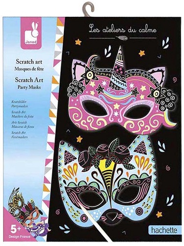 Met deze creatieve kit kan je kind mooie kleurrijke maskers maken en ze gebruiken om zich te verkleden. Kras gewoon op de voorgetekende maskers om de kleuren te zien verschijnen! Deze set bevat: 5 uitgeknipte krasmaskers (3 in zwart, 1 blauw, 1 paars), met kleur- of verguldingseffecten, 5 zilveren elastiekjes, 1 houten stift en 1 boekje met modellen en instructies. Een perfecte activiteit voor een verjaardagsfeestje!