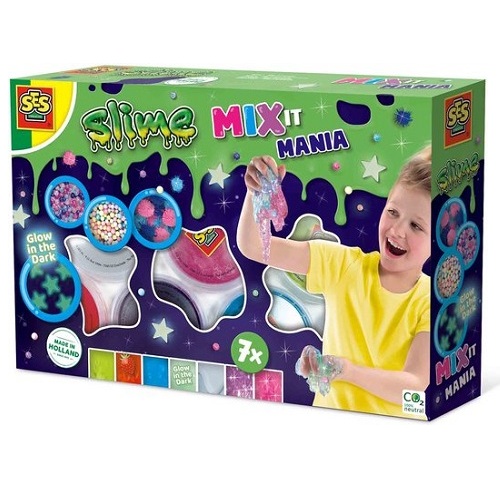 Deze Mix it Mania slijm set is de droom van elk kind! Met maar liefst 7 potjes slijm zijn de mogelijkheden eindeloos. Mix de kleuren slijm of meng het slijm met parels, foam ballen, glow in the dark sterren of glitter pompons. Alles kan en alles mag met de Mix it Mania set! De slijm van SES Creative is veilig voor kinderen en voldoet aan alle veiligheidseisen.