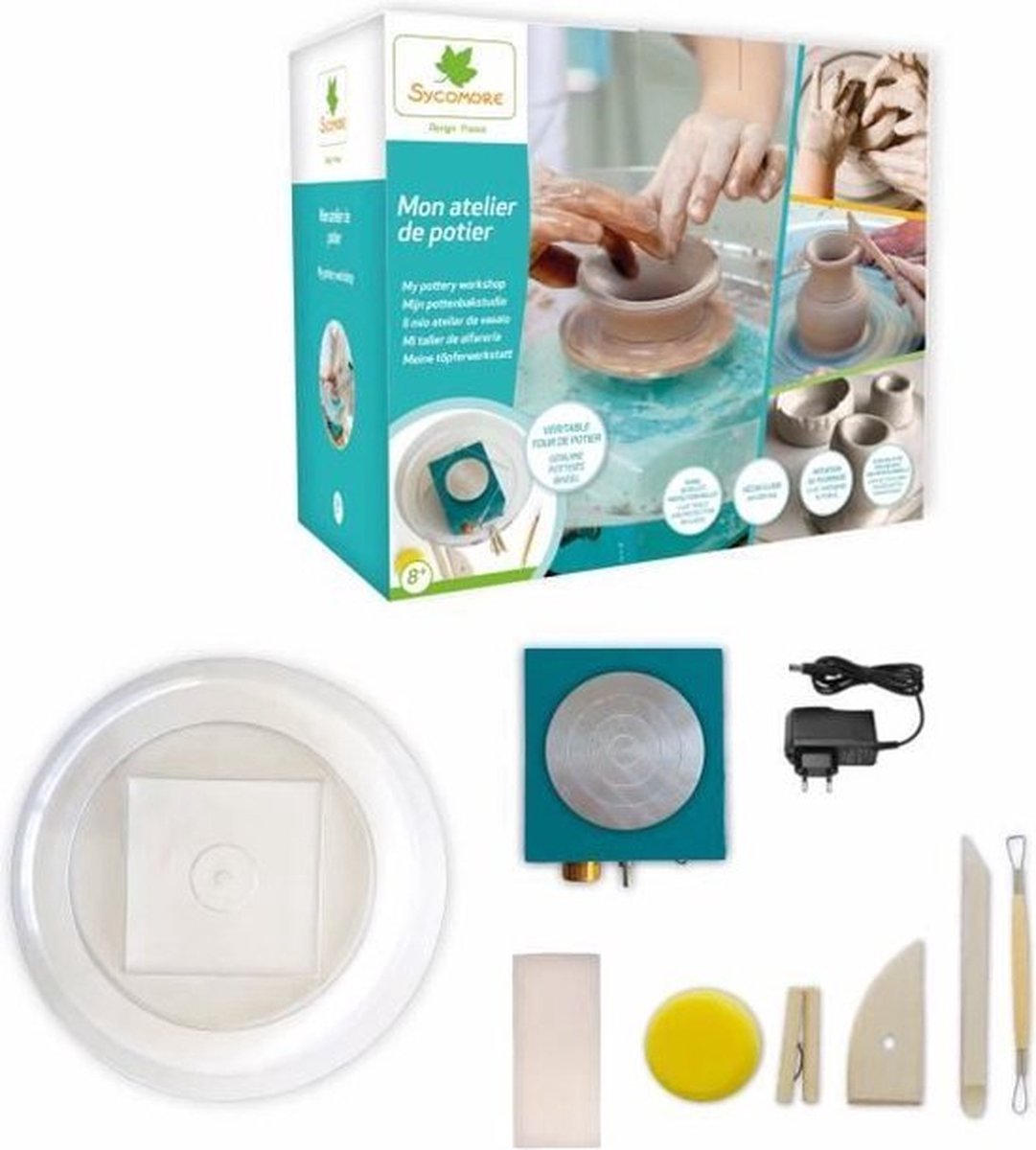Ontdek de Sycomore Pottery Workshop Set, een creatieve hobbyset voor kinderen vanaf 8 jaar, met een compacte en gemakkelijk op te bergen pottenbakkersschijf met een aluminium voet.