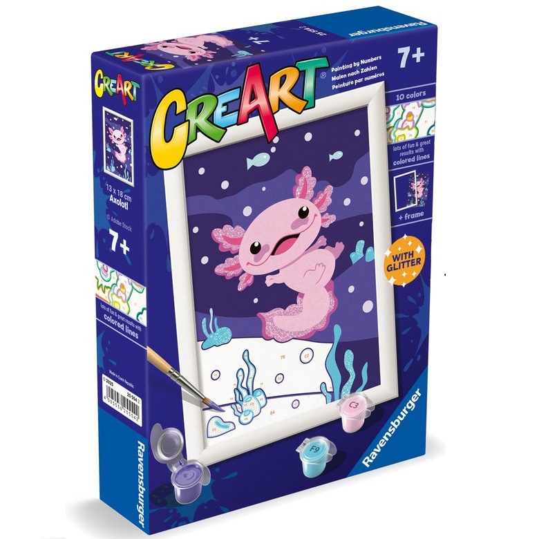 Laat kinderen de magie van schilderen ontdekken met CreArt Axolotl van Ravensburger! Met deze schilderen-op-nummer-set kunnen jonge kunstenaars een kleurrijk kunstwerk maken van een sch