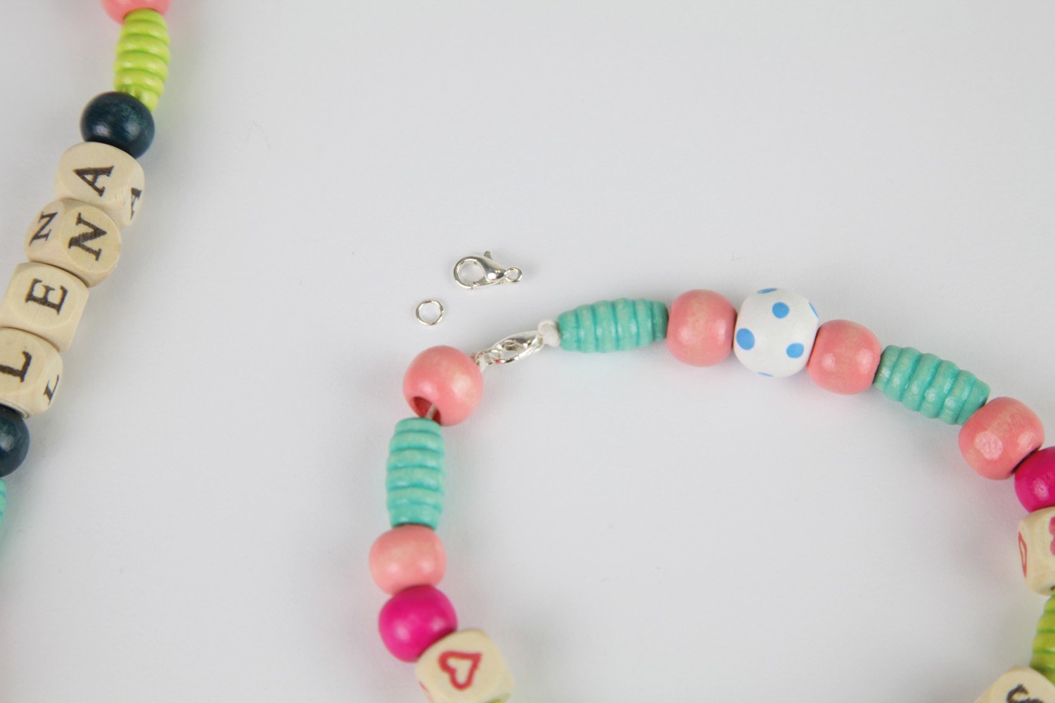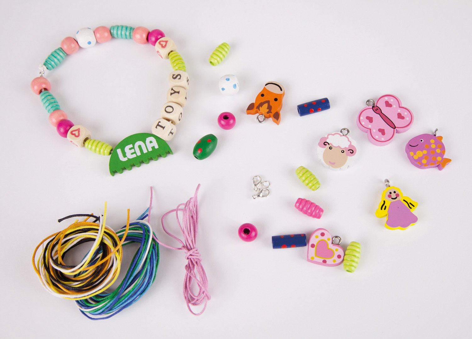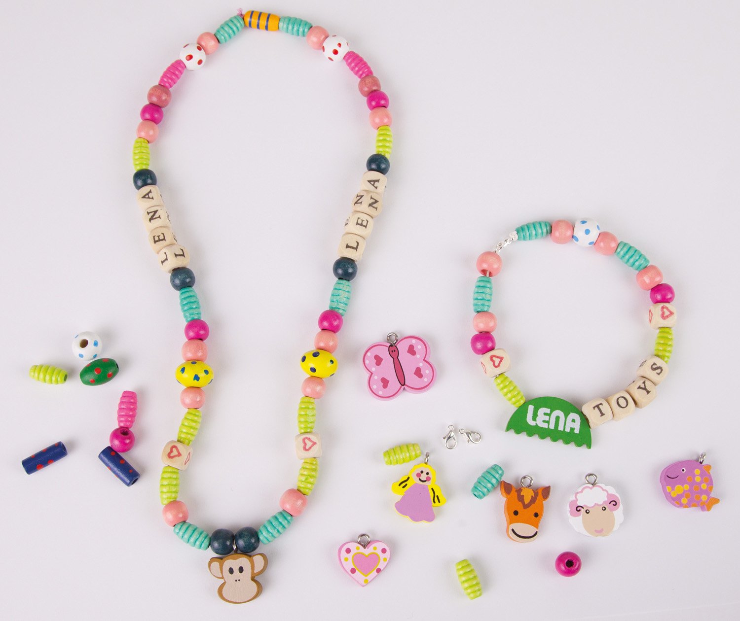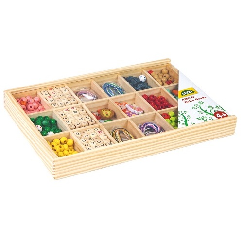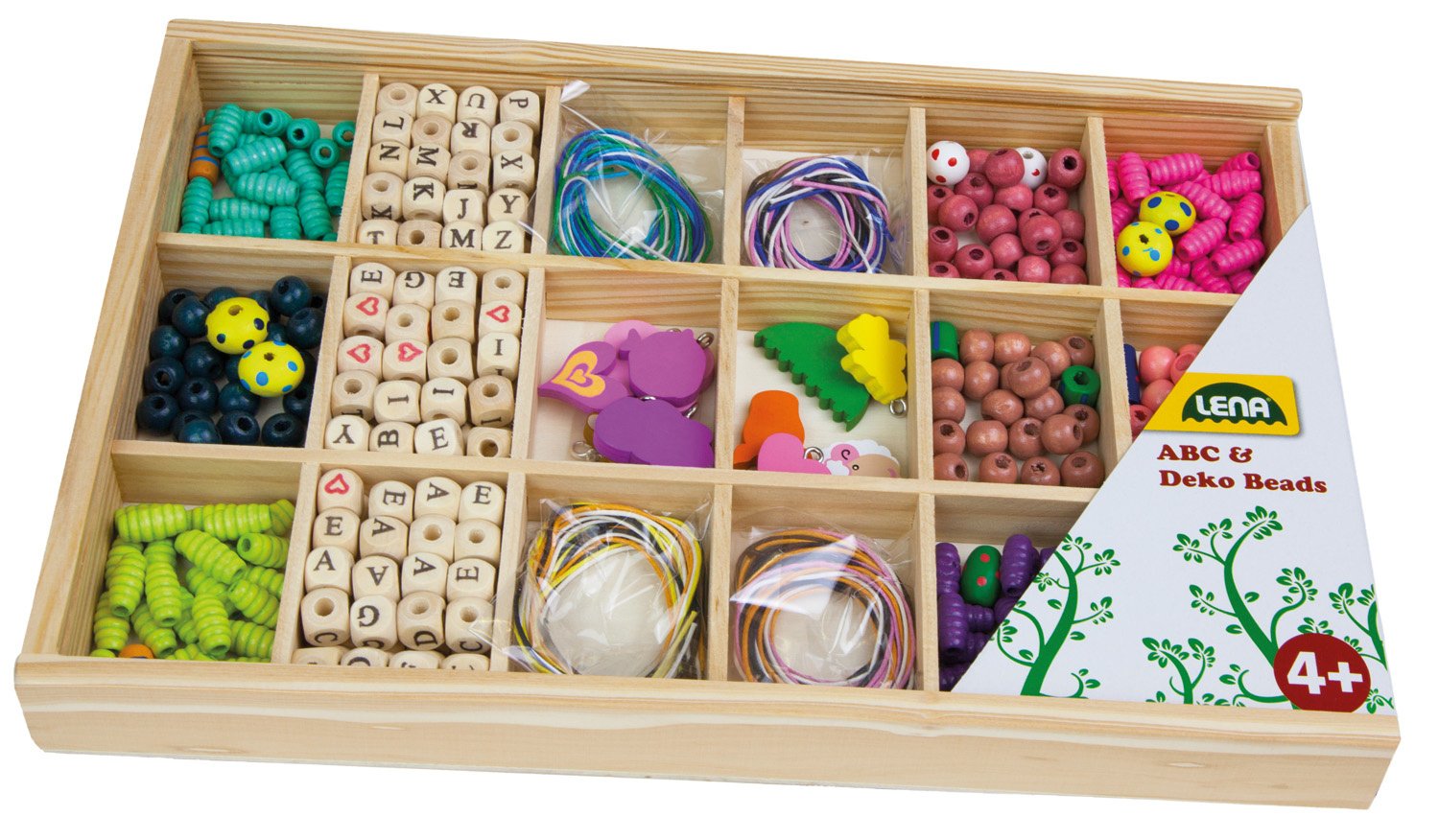 Grote Houten Kralen Cassette met 315 gekleurde houten kralen, 3 x compleet alfabet, 9 bedels met dieren- en hartvorm en één LENA®-bedel.