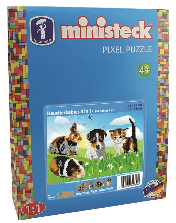Ministeck Pet Babies 4in1 – XL Box – 1800pcs Afmeting grondplaat: 26 x 33cm Ministeck voorziet al sinds 1950 jong en oud van creatief vermaak. Met keer op keer nieuwe sjablonen kan je jezelf telkens weer uitdagen met een nieuw ontwerp. Of je nu be