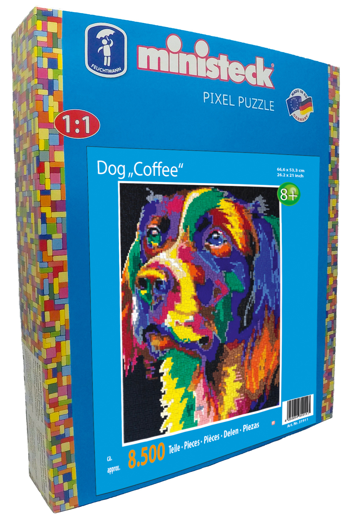 Ministeck ART Colorfull Dog Coffee – XXL Box – 8500pcs Afmeting grondplaat: 66,6 x 53,3cm Ministeck voorziet al sinds 1950 jong en oud van creatief vermaak. Met keer op keer nieuwe sjablonen kan je jezelf telkens weer uitdagen met een nieuw ontwerp. Of je nu beginner bent of een meesterwerk van meer dan 30.000 stukjes op het bord legt, met het uitgebreide assortiment is er altijd een ontwerp die je past. Druk de pinnetjes op de juiste plaats en zie beetje bij beetje de afbeelding tot leven komen. Volg de bestaande ontwerpen of laat je fantasie het werk doen.