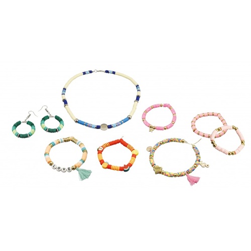 Maak 1 ketting, 6 armbanden en een paar oorbellen.