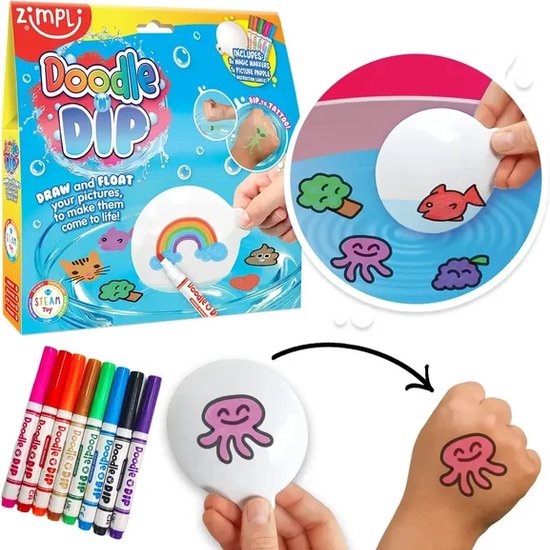 Pak die magische pennen en ga tekenen! Met Doodle N Dip kun je je kunstwerken tot leven brengen. Teken eenvoudig karakters of andere creatieve dingen op het magische tekenblad en dompel het vervolgens verticaal in een kom met water van minimaal 10 cm diep