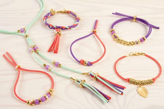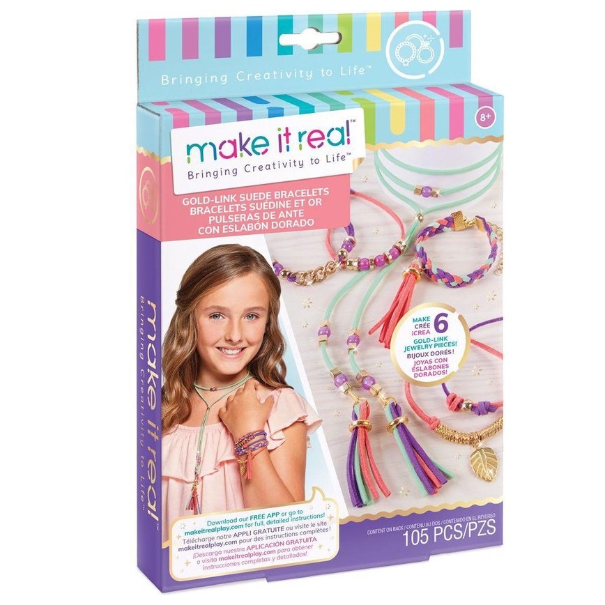 Jonge ontwerpers kunnen hun hart ophalen met dit ‘Do It Yourself’ Suede Armbandjes met gouden Schakels pakket. Mix & Match de 3 gekleurde suede bandjes met de goudgekeurde schakels en kralen en maak 3 fantastische, unieke armbandjes! Inclusief een handige