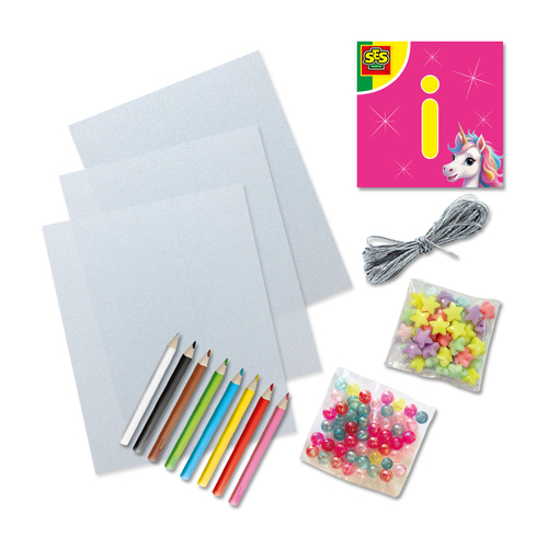 Met krimpfolie maak je je eigen unicorn bedels. Trek de figuren eenvoudig met kleurpotlood over van de instructies en kleur ze in zoals je zelf wilt. In de oven krimpen de bedels snel en worden zo kleiner, intensiever van kleur en sterker. Rijg ze samen met de sterren en parelmoer kleuren kralen aan het elastiekdraad en creëer zo 5 prachtige, unieke armbanden.