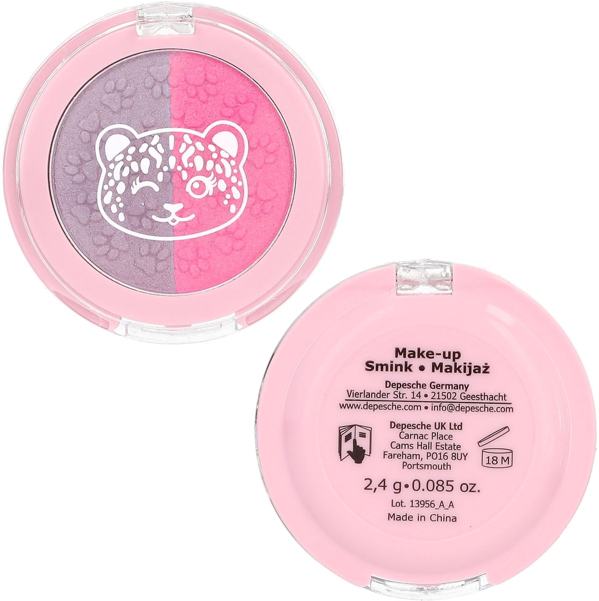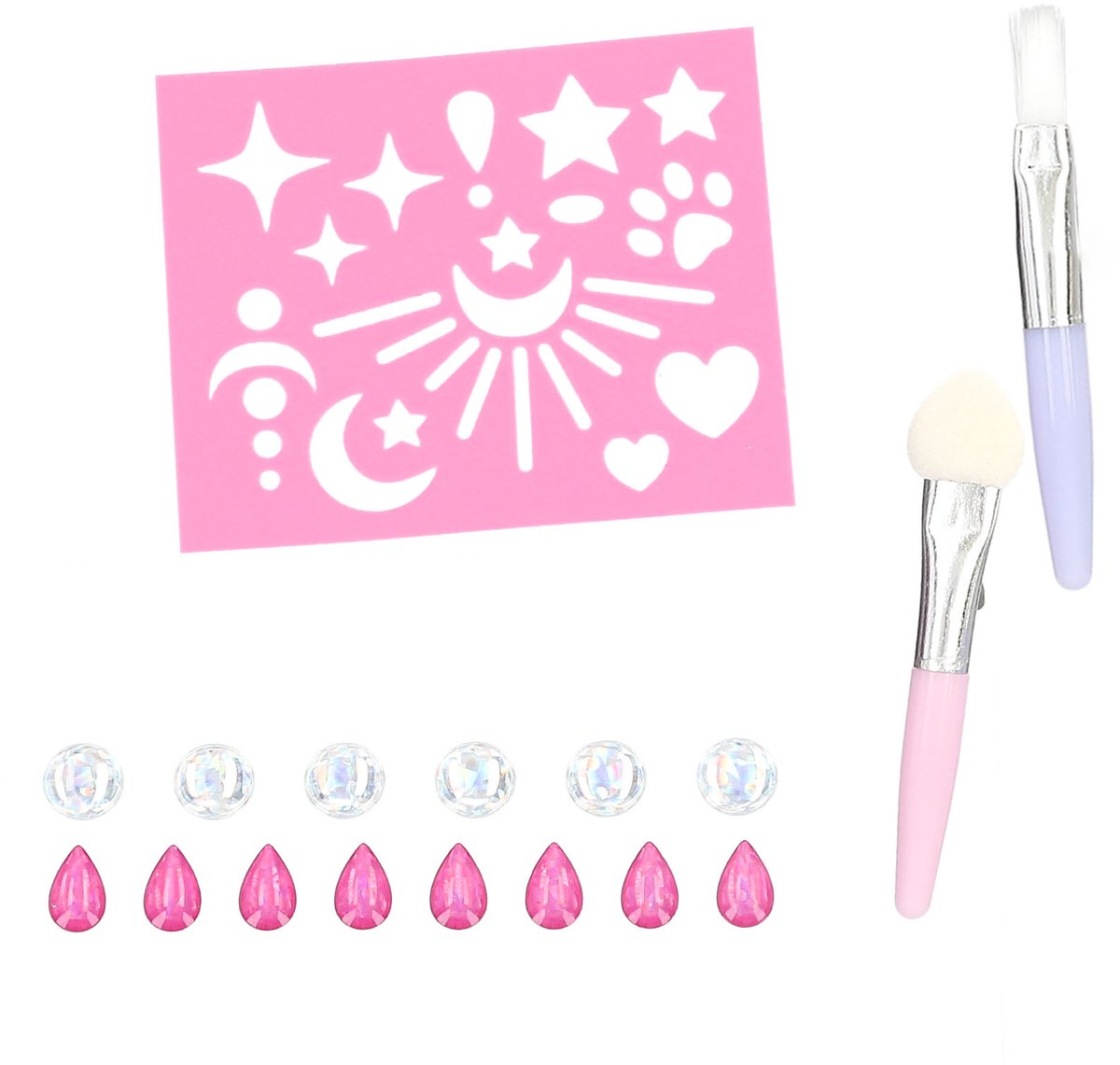 De TOPModel make-up set met magisch glinsterende sterren, manen en schattige dierenpootjes bevat 1 paars make-up potlood (0,9 g), 1 zilverwitte bodyglittergel (12 ml), paarse en roze make-up in een klein potje (2,4 g), 14 mooie decoratieve stickers voor op de huid en 2 kwasten.
