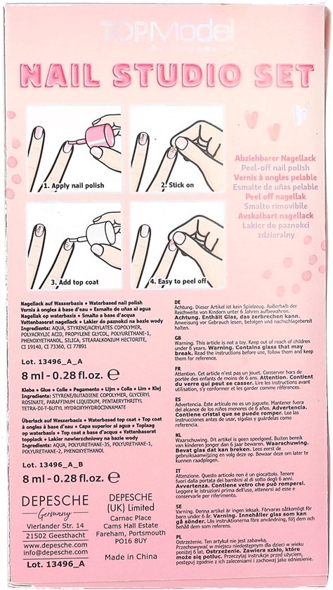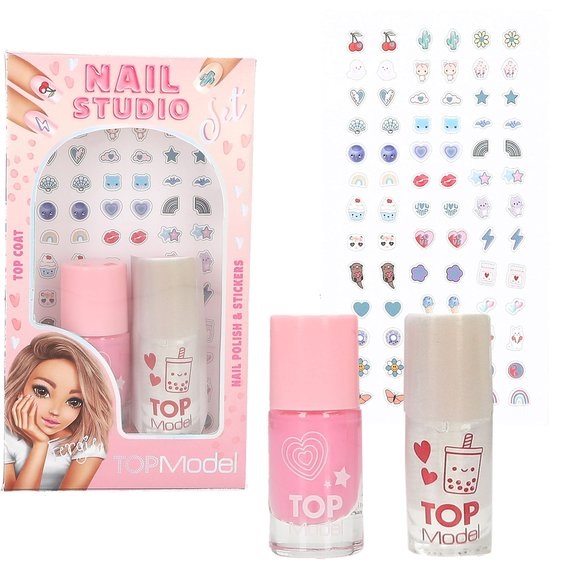 Cool en easy! Met de nagelstudio set van TOPModel kun je heel makkelijk toffe nageldesigns maken. Ingesloten: roze nagellak (op waterbasis, 8 ml), transparante topcoat om te fixeren (op waterbasis, 8 ml) en heel veel leuke nagelstickers.