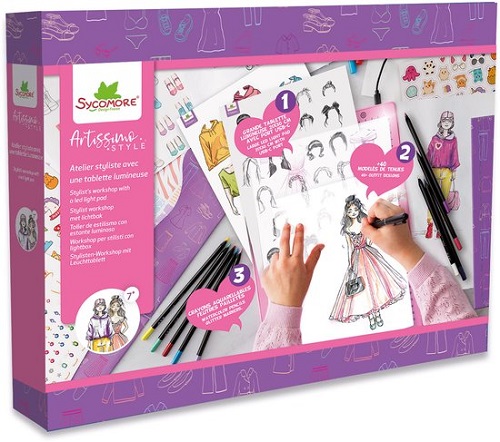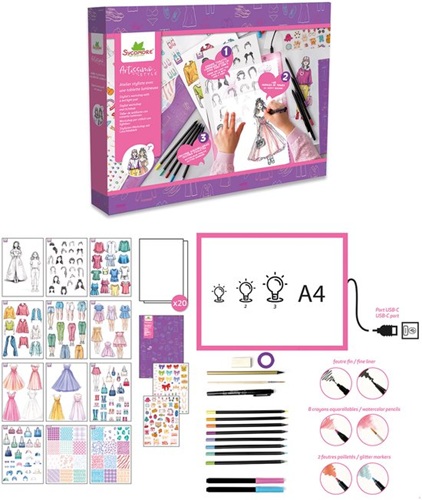 Laat je modecreaties tot leven komen met de Au Sycomore Artissimo Styling Workshop Met Lichttablet! Deze creatieve set combineert een lichttablet met allerlei leuke materialen om je eigen stijlvolle ontwerpen te tekenen en uit te werken. Perfect voor jonge ontwerpers die hun fantasie willen omzetten in prachtige outfits, van schets tot afgewerkt kledingstuk. Het lichte A5-lighttablet helpt je lijnen duidelijk te zien, zodat overtrekken en details perfectioneren eenvoudig wordt. Zo ontwikkel je spelenderwijs je tekenvaardigheden, oog voor stijl en creatieve expressie. Met de Au Sycomore Artissimo Styling Workshop wordt elk mode-avontuur een stijlvol en inspirerend project!