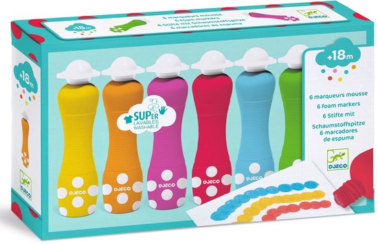 Foam markers van Djeco. Deze markeerstiften maak je prachtige tekeningen en zijn ook ideaal om mee te stempelen. Dankzij de vorm zijn de markers gemakkelijk vast te pakken en de inkt is uitwasbaar.