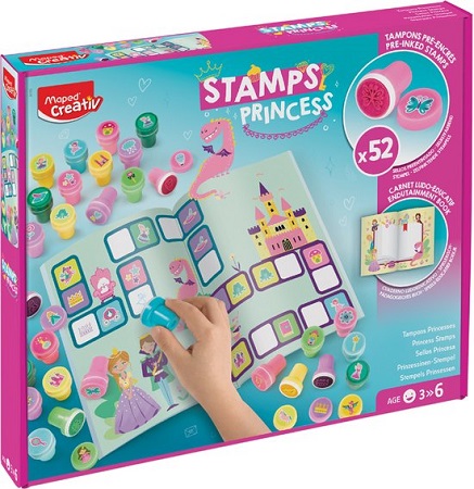 Creatieve stempelset met 52 zelfinktende prinsessen-stempels. Uitwasbaar uit de meeste stoffen. Inclusief activiteitenboekje met sjablonen. Ideaal voor kinderen van 3-6 jaar.