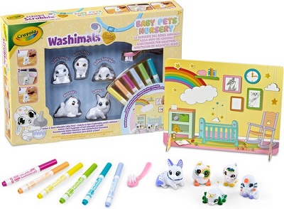 Ontdek de Washimals Baby Huisdierenopvang Set van Crayola! Met deze set kunnen kinderen hun eigen puppy’s verzorgen door ze in te kleuren met de meegeleverde uitwasbare stiften, en vervolgens weer schoon te maken met de bijgeleverde borstel. De zachte, fluweelachtige vachtjes van de puppy’s zorgen voor een geweldige kleurervaring.