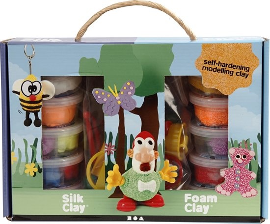 Inhoud: Foam Clay in 10 kleuren en Silk Clay in 10 kleuren. Plus gereedschap, uitsteekvormen, 9 paar ogen, diverse lichaamsonderdelen en 5 sleutelhangers om de creaties aan te hangen.