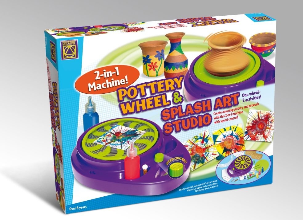 De 2-in-1 pottenbakkersmachine en splash art studio is ideaal voor jonge kunstenaars! Of je nu mooie vazen en potten wilt maken of mooie spletterschilderijen, met dit apparaat maak jij altijd prachtige knutselwerken. Het enige wat je hoeft te doen is de s