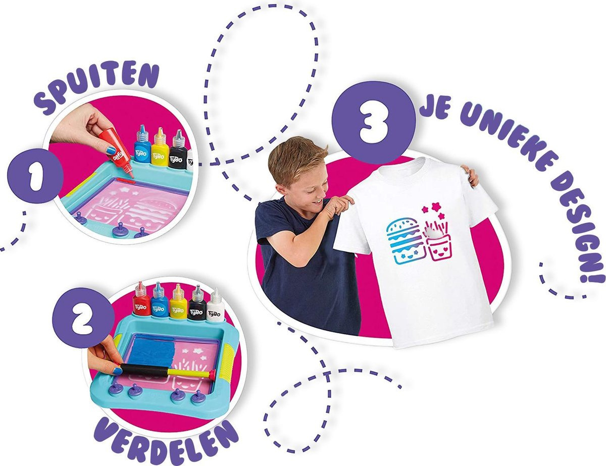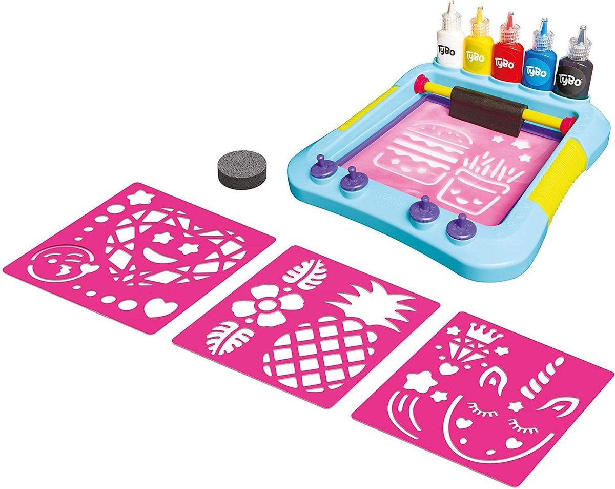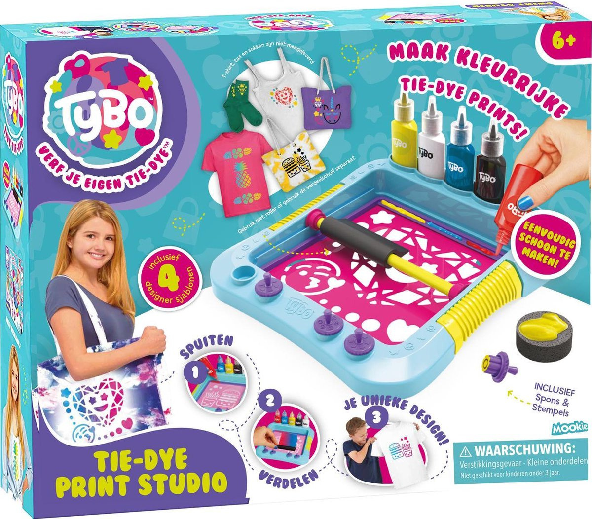 De TYBO Tie-Dye Print Studio is een compleet en eenvoudig te gebruiken starterspakket waarmee je kleurrijke prints op textiel kunt drukken. Met de sjablonen, textiel verf, verdeelschuif en overige accessoires kun je met de TYBO Tie-Dye Print Studio unieke