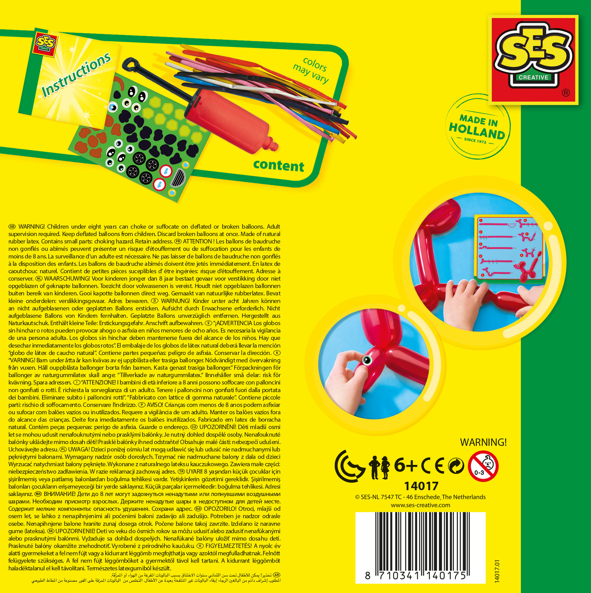 Met deze set van SES Creative leggen we je stap voor stap uit hoe jij zelf ballonnen in de mooiste figuren kan modelleren. Klaar met vouwen? Pak dan het stickervel en geef je diertjes oogjes, de auto wielen en je giraffe vlekjes.