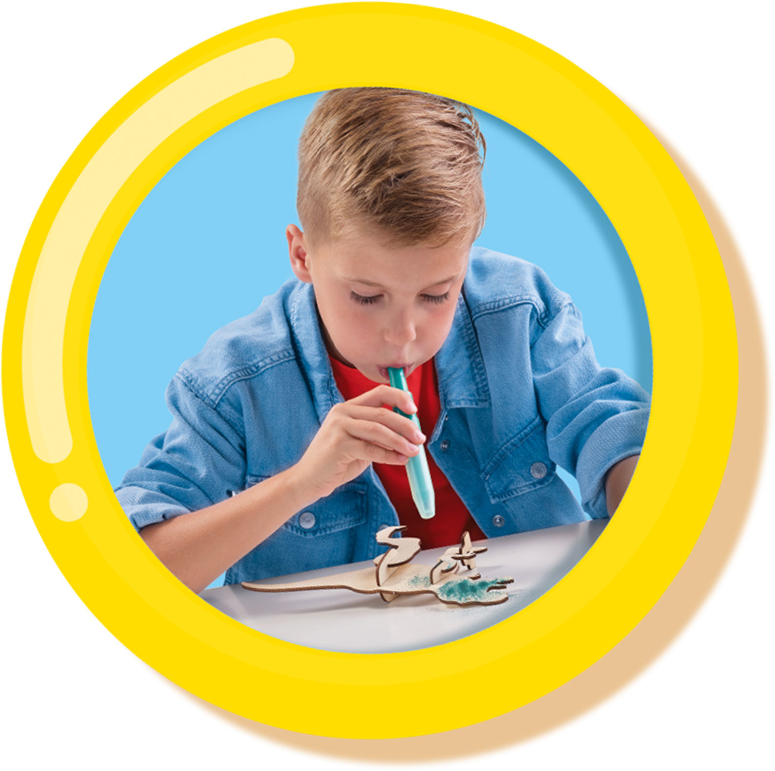 Dit zijn bijzondere stiften! In tegenstelling tot normale viltstiften moet je hierbij blazen om te kunnen kleuren. Ze geven dan een spray effect waarmee je toffe kleuroverlopen kunt maken! In deze set zitten twee houten dino frames die jij geheel naar eig