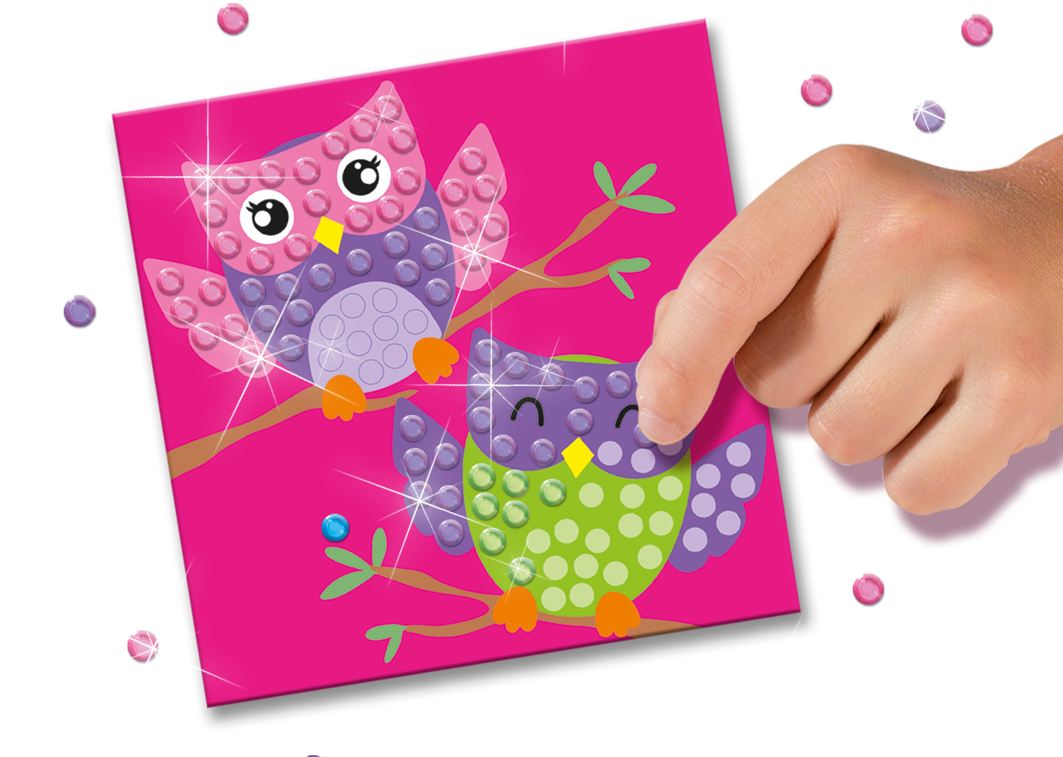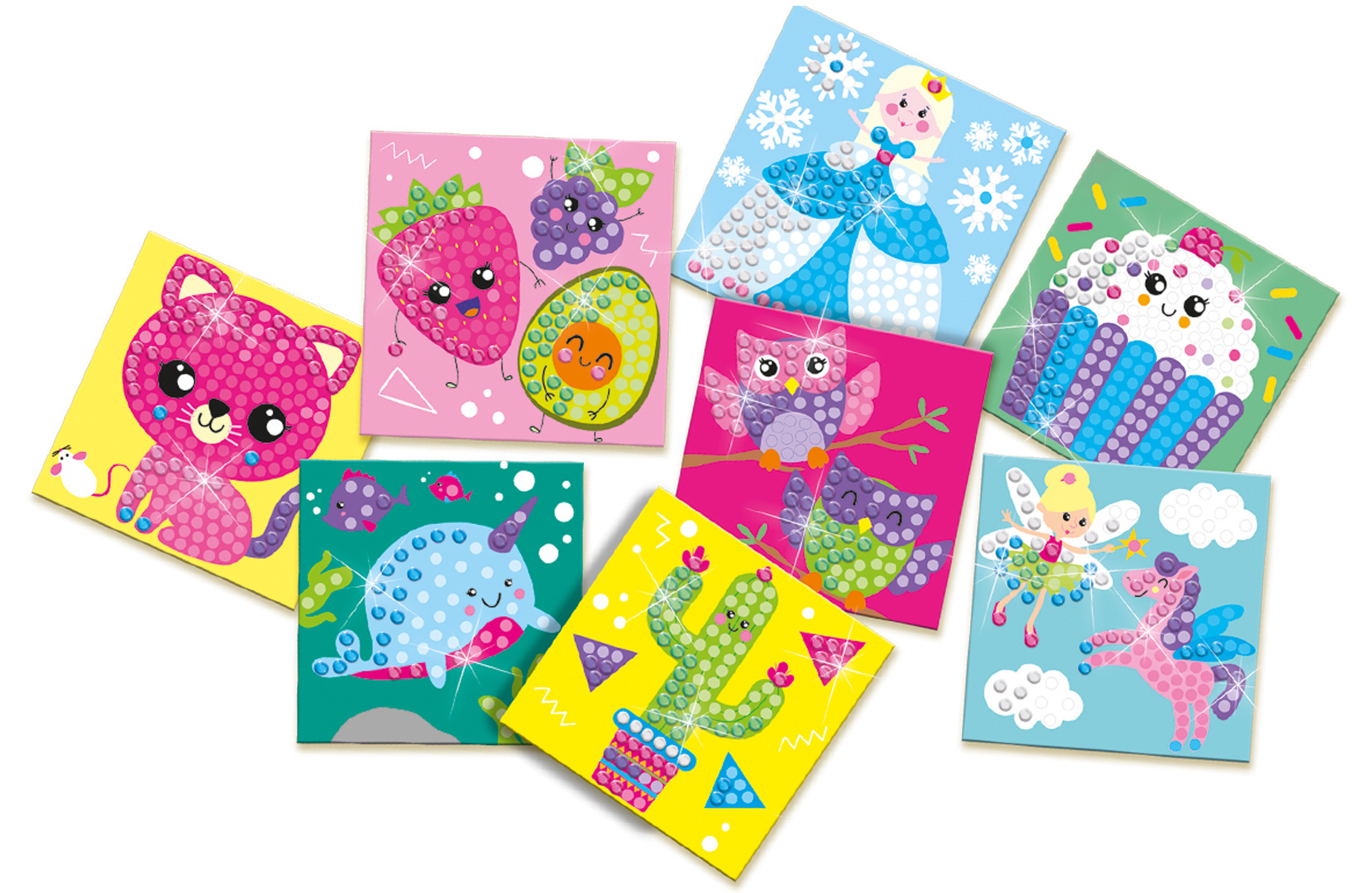 Diamond painting junior. Doordat de glimmende diamantstippen zelfklevend zijn, plakken ze heel gemakkelijk op de kleurrijke kaarten!