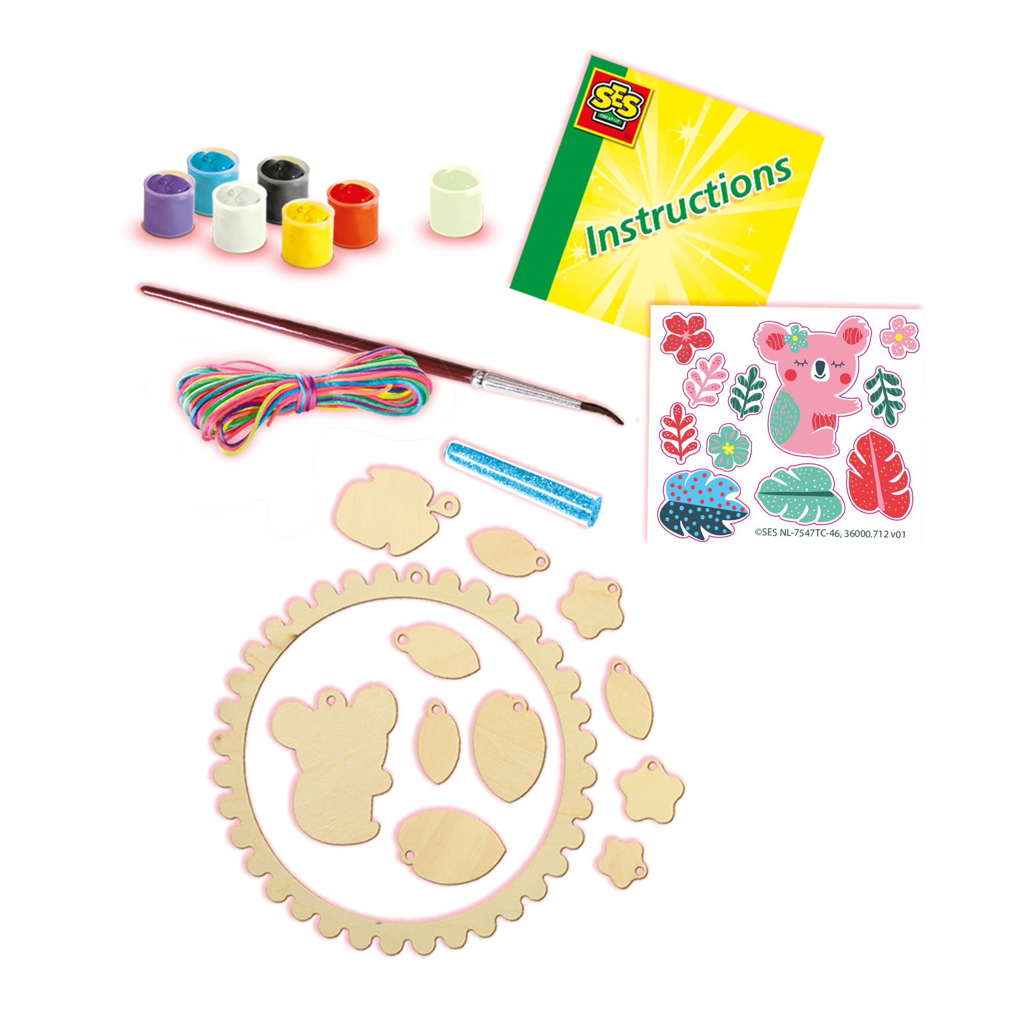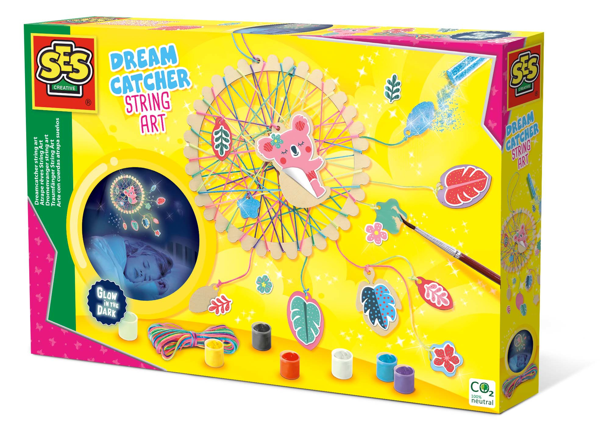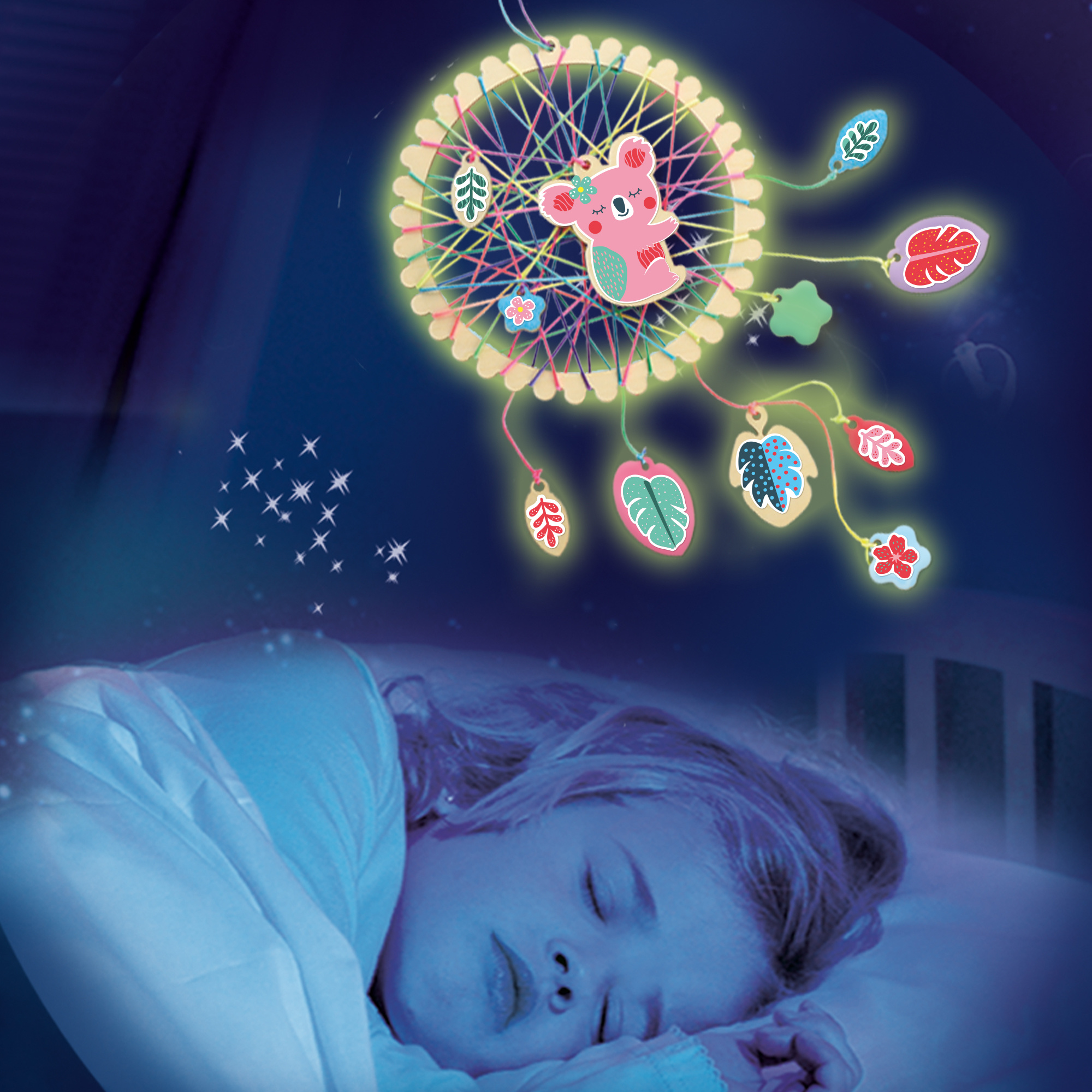 Welterusten! Deze kleurrijke dromenvanger stimuleert niet alleen fijne dromen, maar is ook een mooie blikvanger in de slaapkamer van elk kind. Verf de houten onderdelen eenvoudig in je favoriete kleuren, span het neon garen kris-kras door het frame, plak de stickers erop voor de details en gebruik de glow in the dark verf als finishing touch.