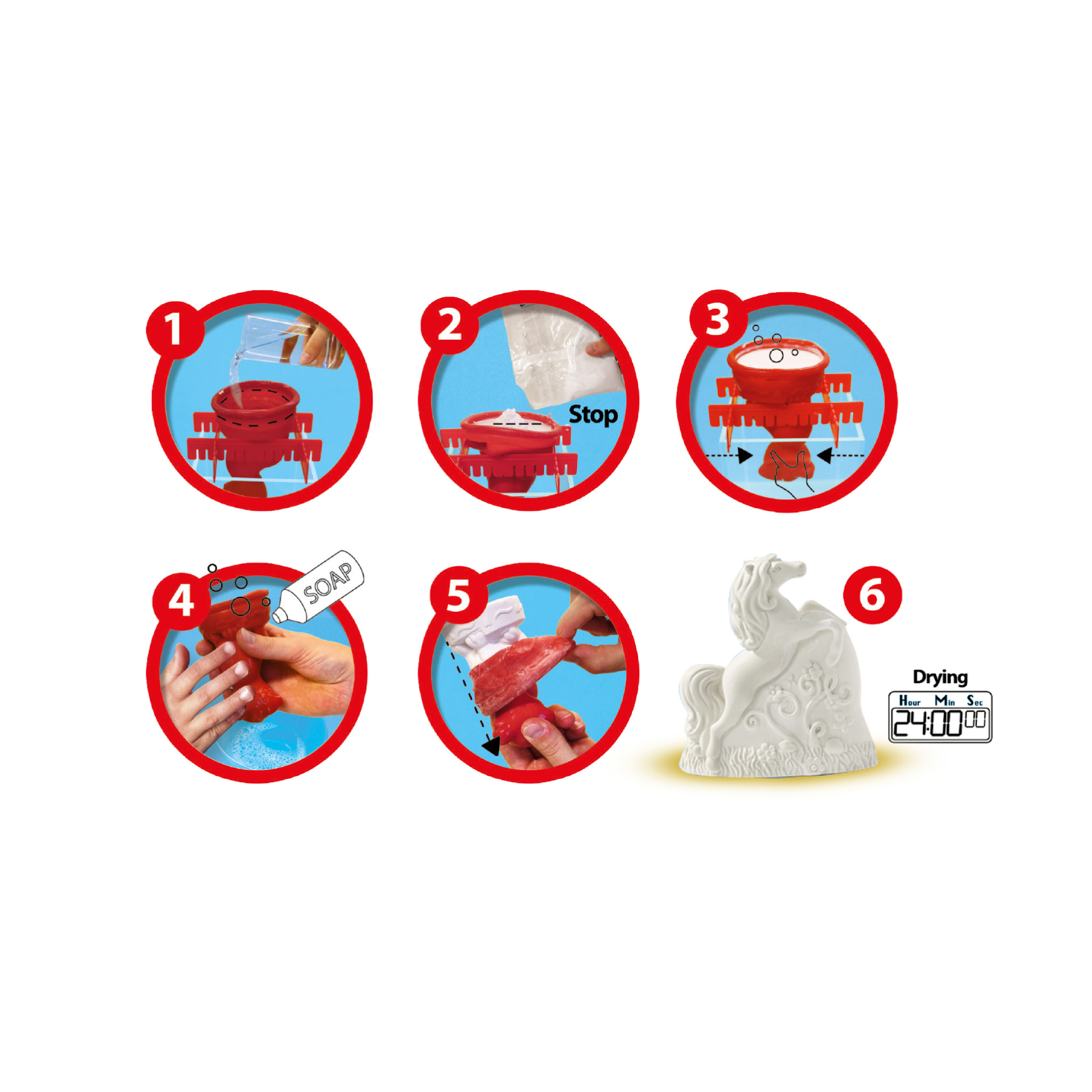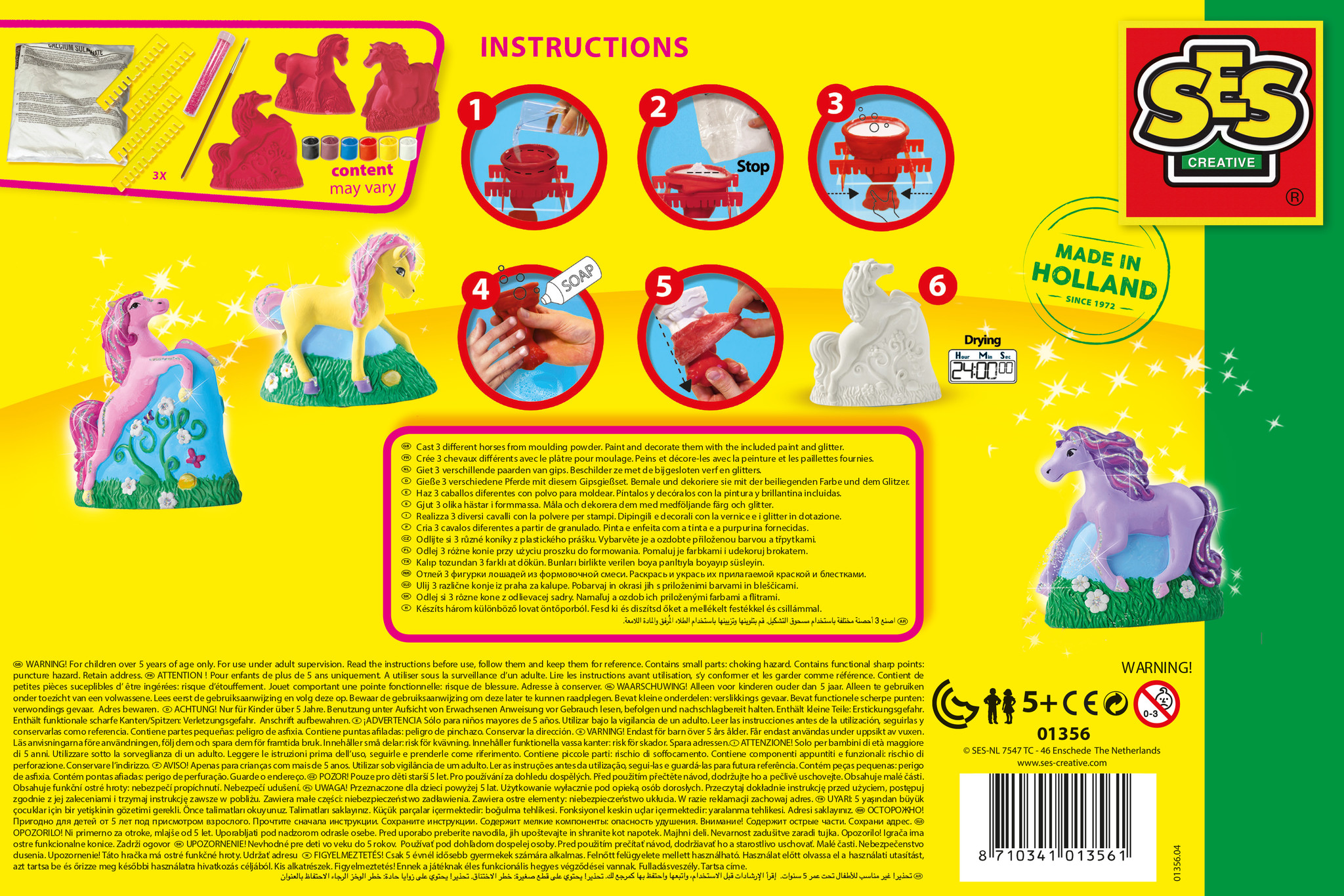Je eigen paardenbeeldjes! Met dit creatieve pakket van SES maak je ze van gips. Giet het gips in de verschillende 3D mallen: een veulen, staand paard en steigerend paard. Laat de beeldjes drogen en beschilder je paarden met de bijgeleverde verf. Leuk om te doen en een super resultaat!