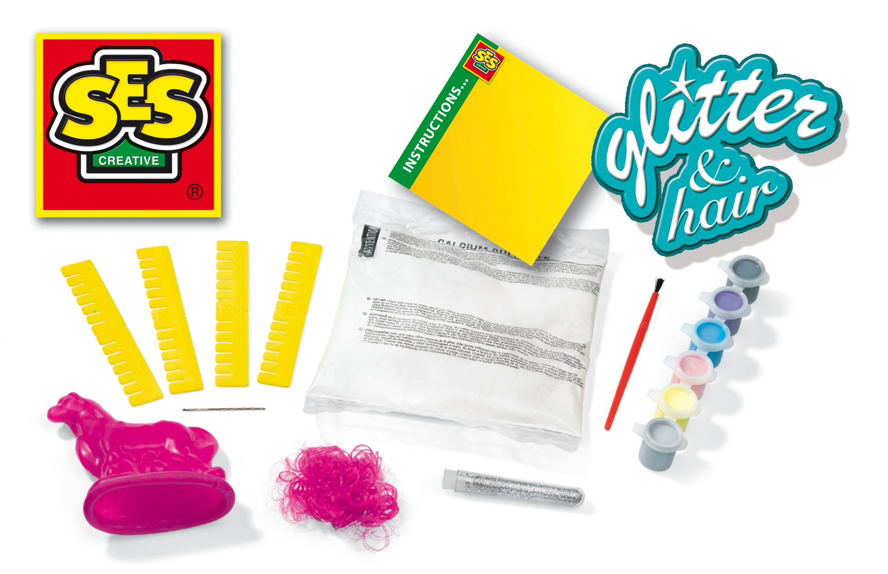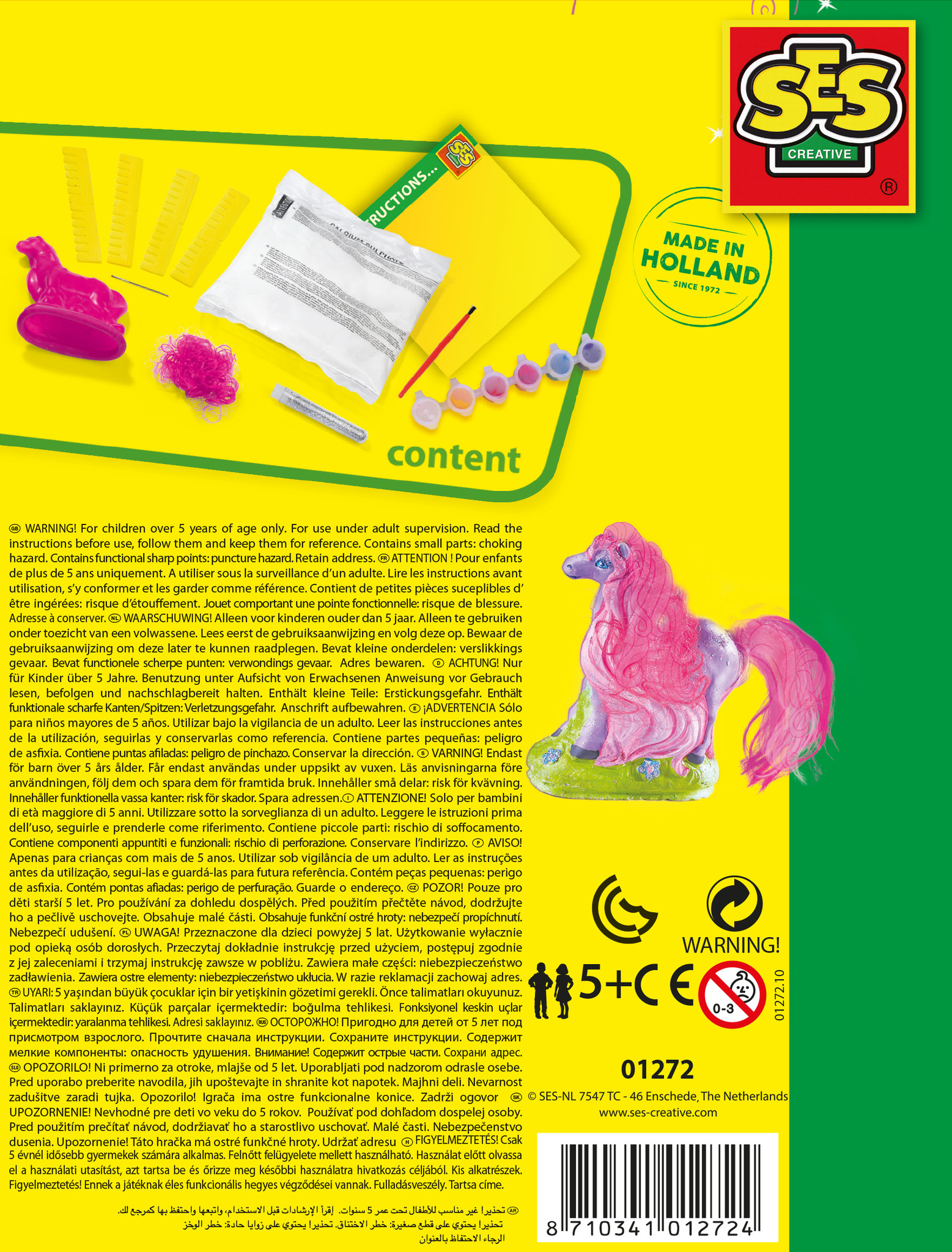 Maak de mooiste beeldwerkjes van gips met SES Creative. Met deze set maak je een mooi paard van gips dat je vervolgens met de bijgeleverde verf beschildert. Het paard wordt nog mooier als je de echte manen erop plakt.