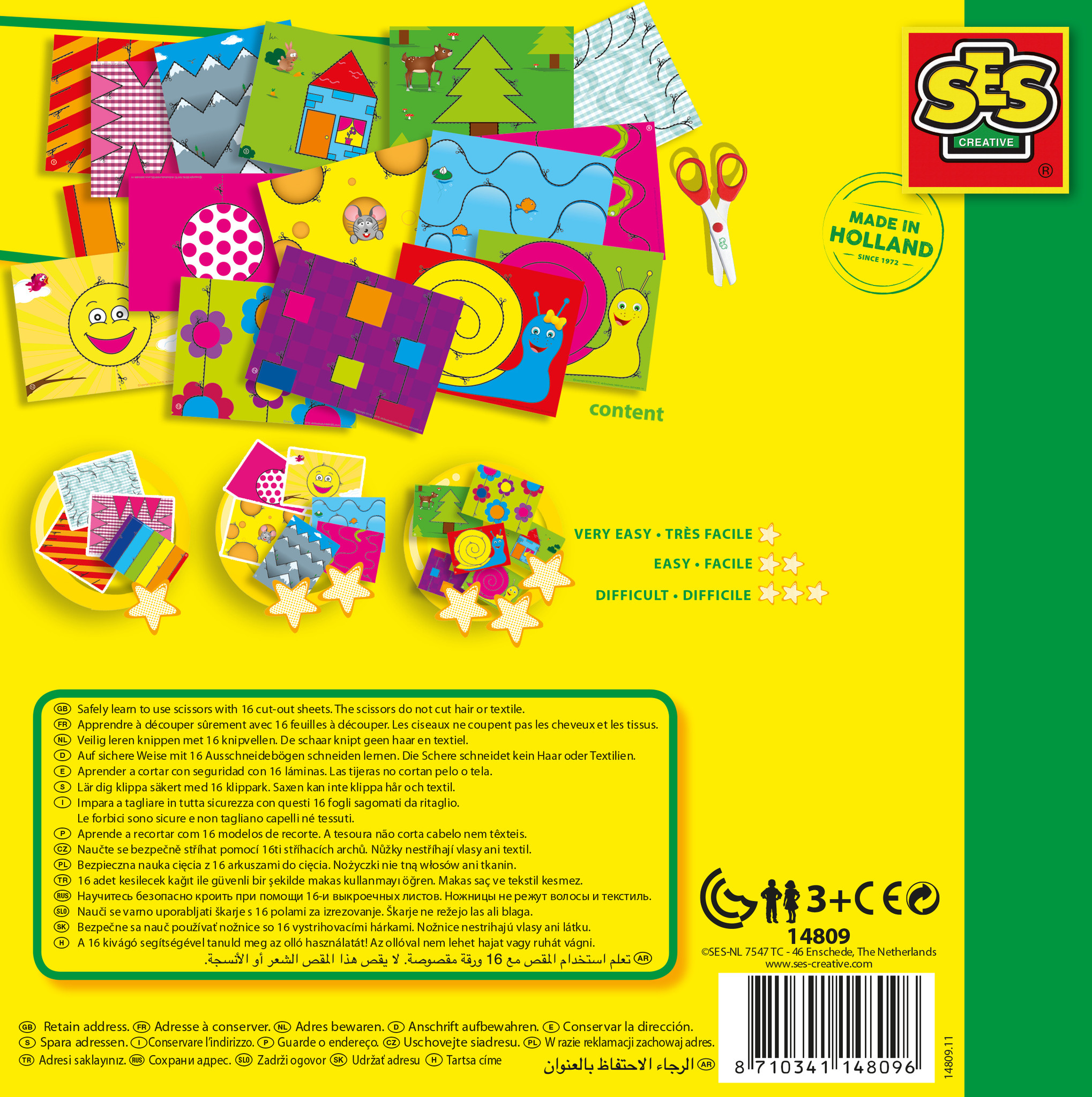 Een schaar gebruiken moet iedereen leren. Met deze set leer je dit op een veilige manier. Dit schaartje kan namelijk alleen papier knippen. Kleren en haren lopen dus geen enkel risico. De voorbedrukte knipvellen bevatten knipopdrachtjes variërend in moeil