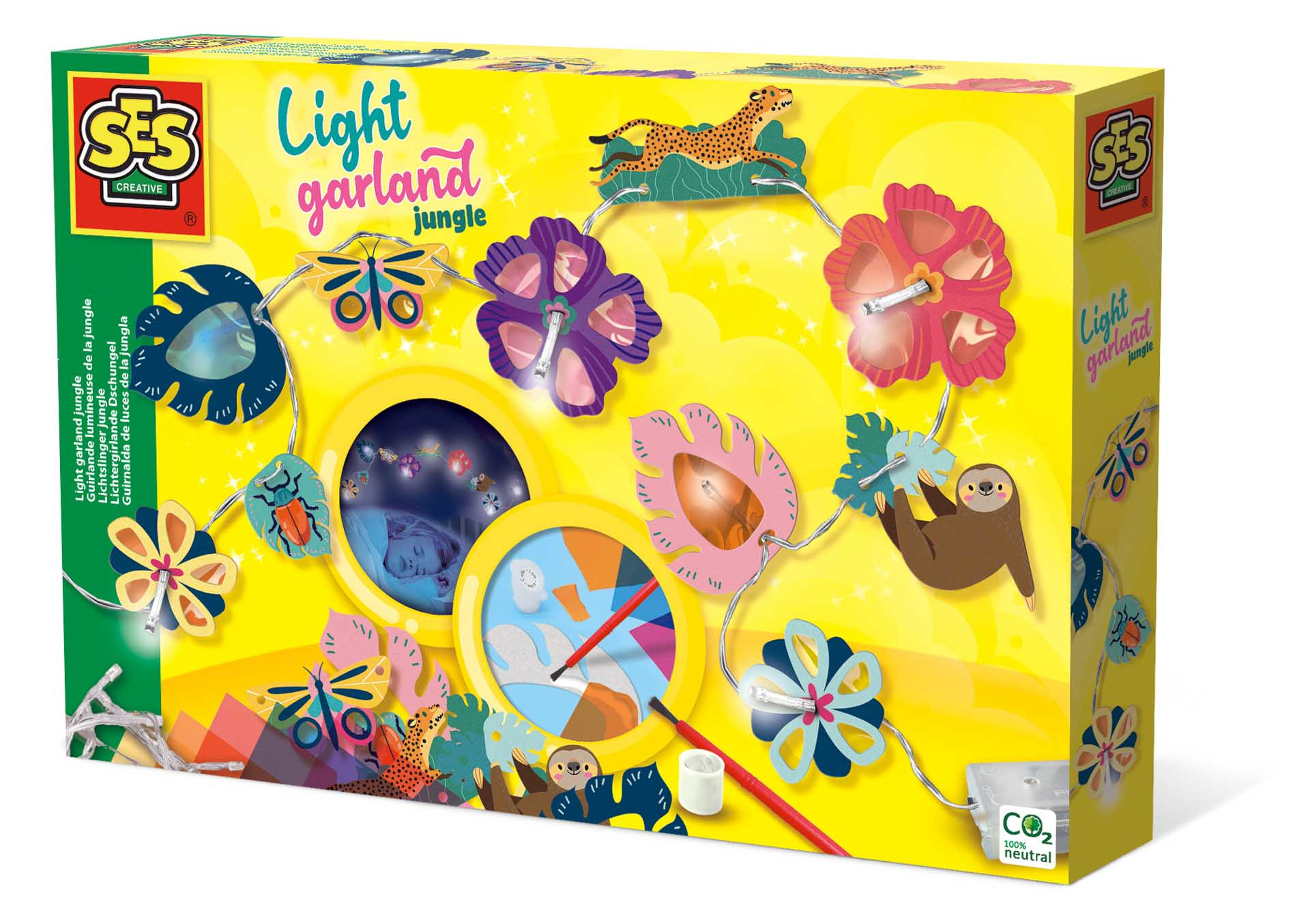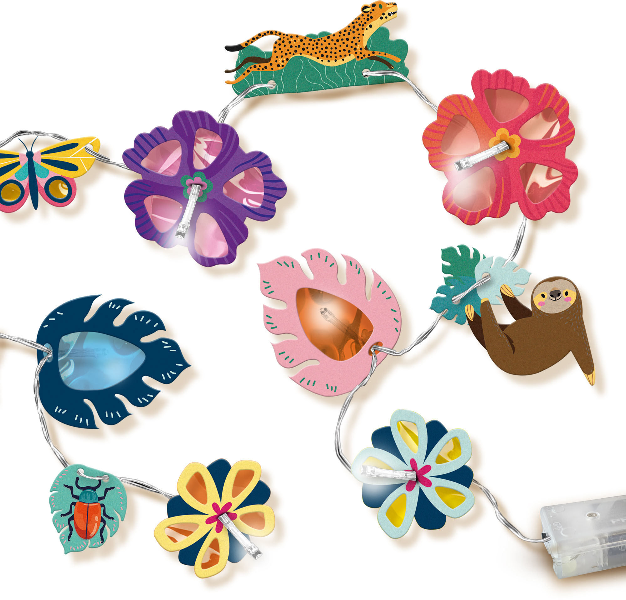 Maak je eigen jungle lichtslinger voor op je slaapkamer. Een echte eyecatcher! In deze set zit een lichtslinger met acht LED-lampjes, vijf gekleurde cellofaan sheets, lijm, penseel, jungle dieren en bloemen. Genoeg benodigdheden om de perfecte slinger te