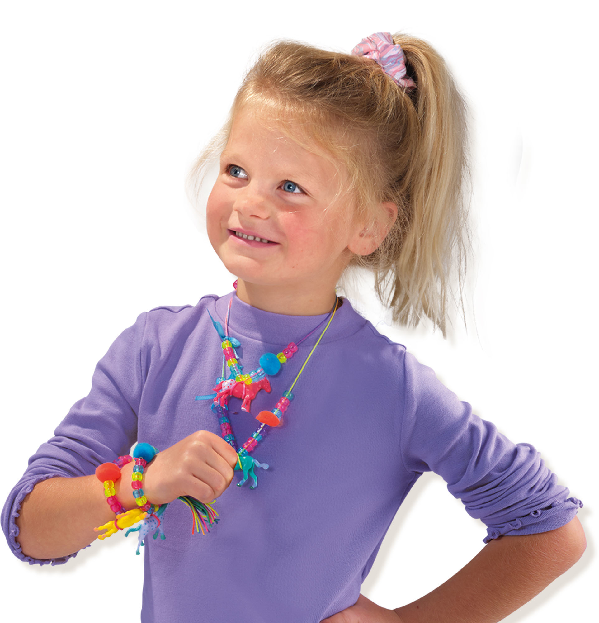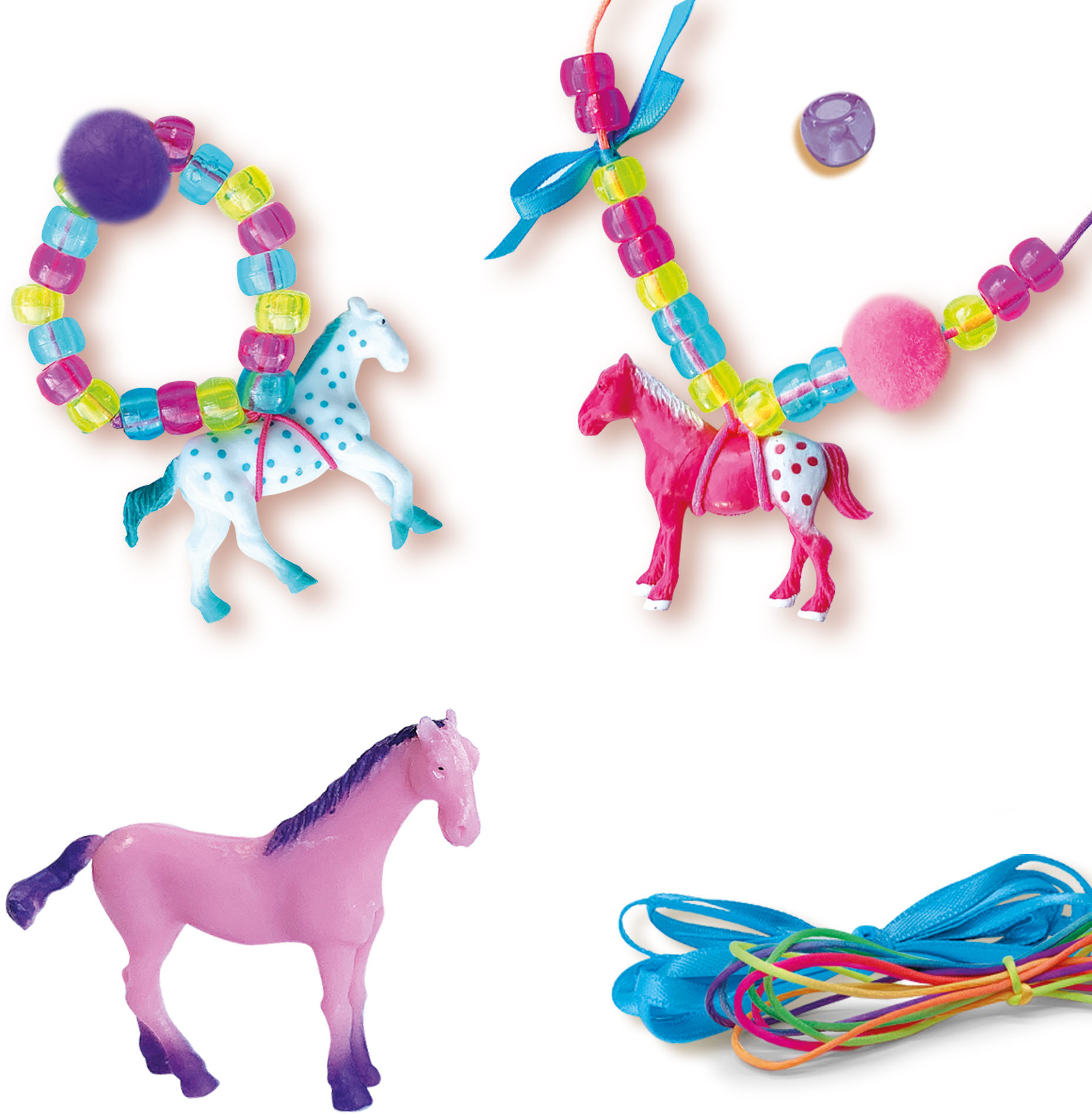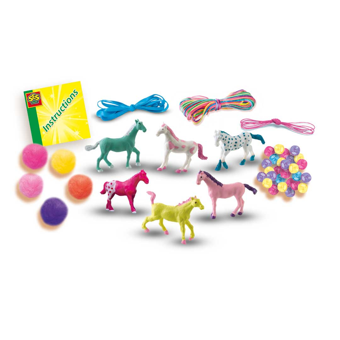 Paardenfans opgelet! Met deze paarden pompon sieraden set kun jij je eigen sieraden maken met kleurrijke paardenhangers. Gebruik het gekleurde draad, de pony beads, het lint en de pompons om bijvoorbeeld een prachtige armband of ketting te maken. Vergeet