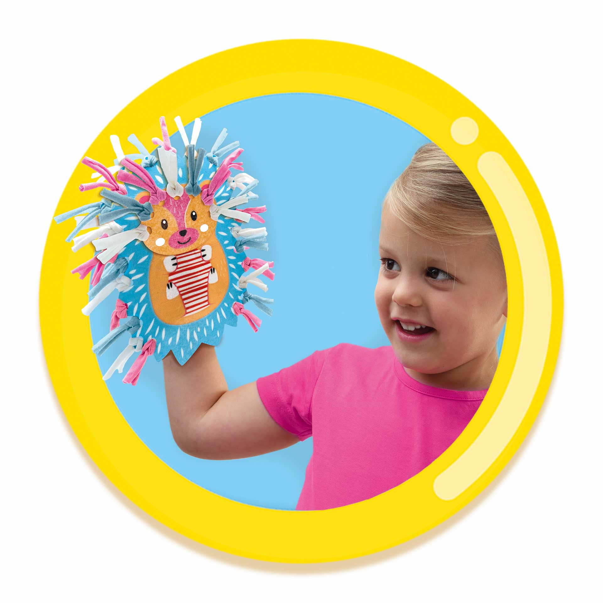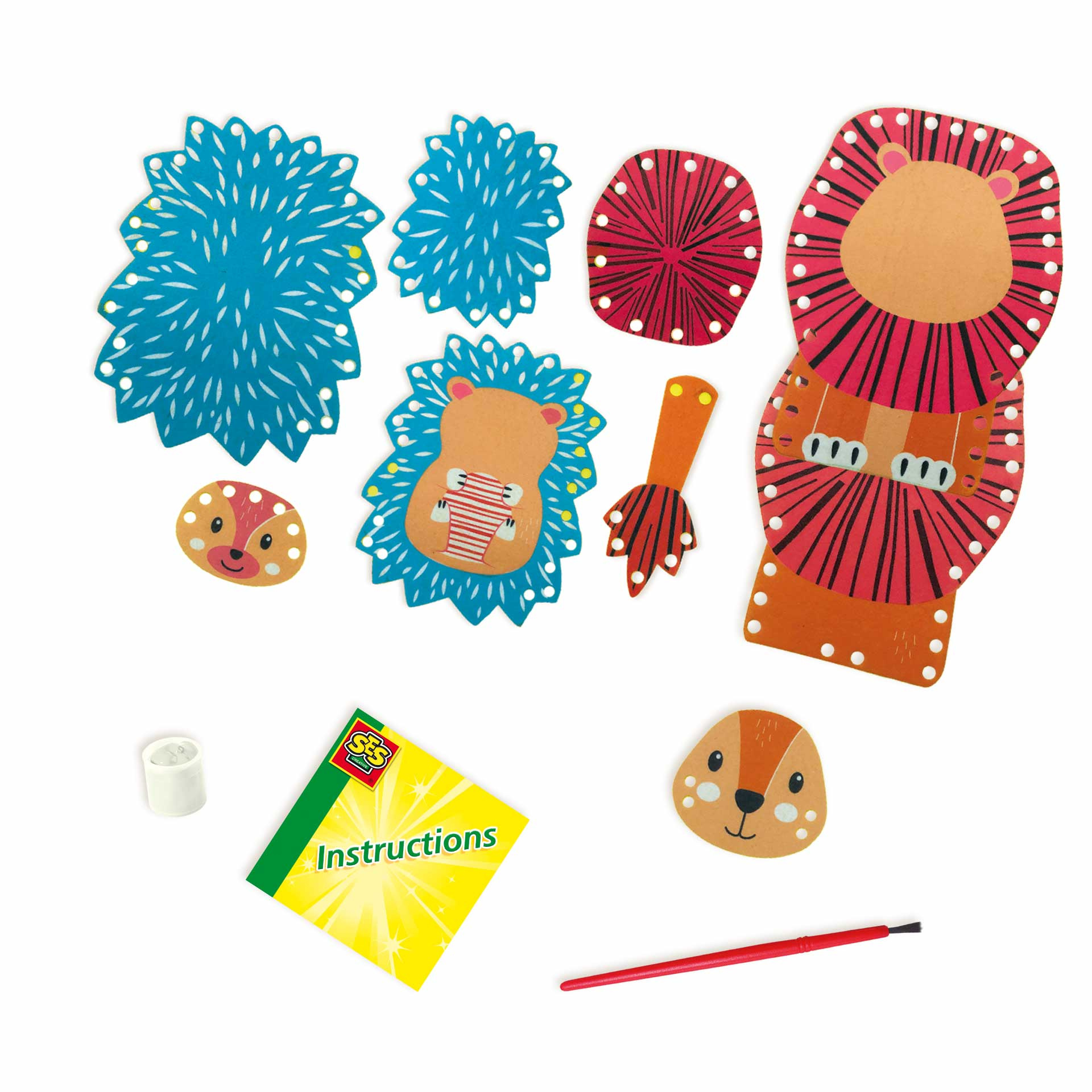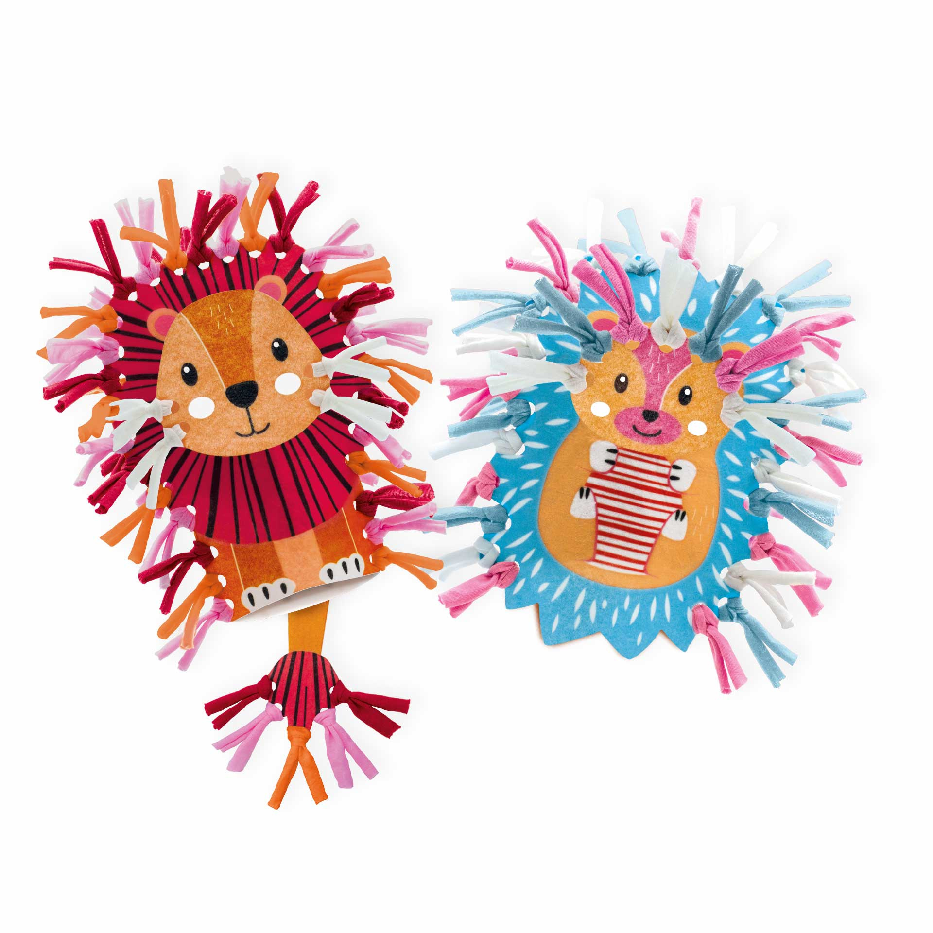 Deze twee schattige handpoppen kun jij helemaal zelf maken zonder naald en draad. De leeuw en de egel bestaan uit verschillende vilt onderdelen. De manen van de leeuw en de stekels van de egel kun je maken van de vijf kleuren T-shirt garen. Breng de diert