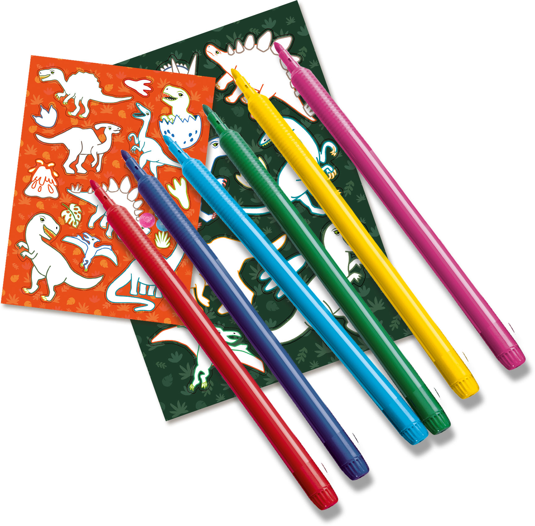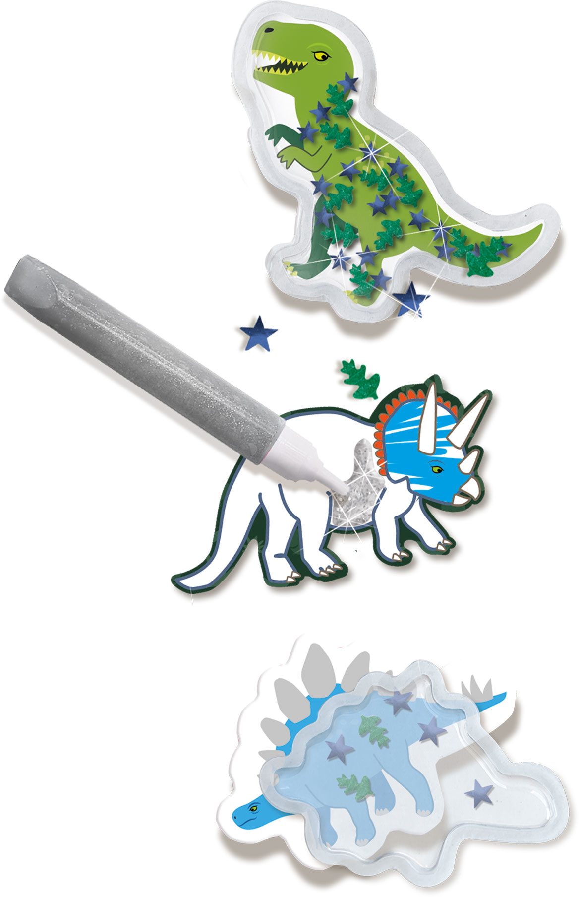 Ontwerp en maak je eigen dino stickers. Kleur je dino in, vul de shaker met de verschillende pailletten en plak de dino kap eroverheen. Naast de dino shaker stickers zitten er nog twee stickervellen vol dinosaurussen in. Deze kun je inkleuren met de vilts