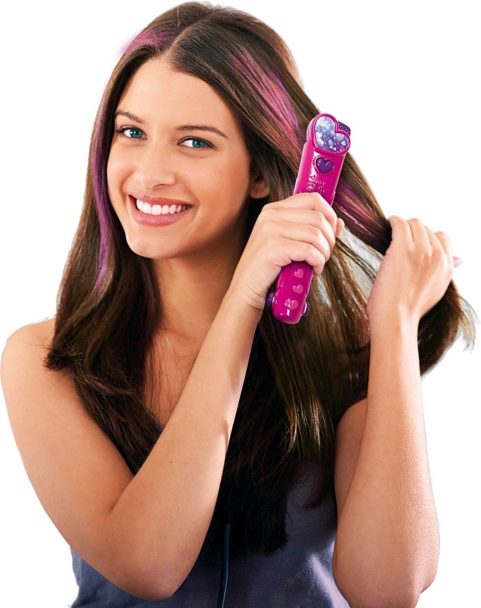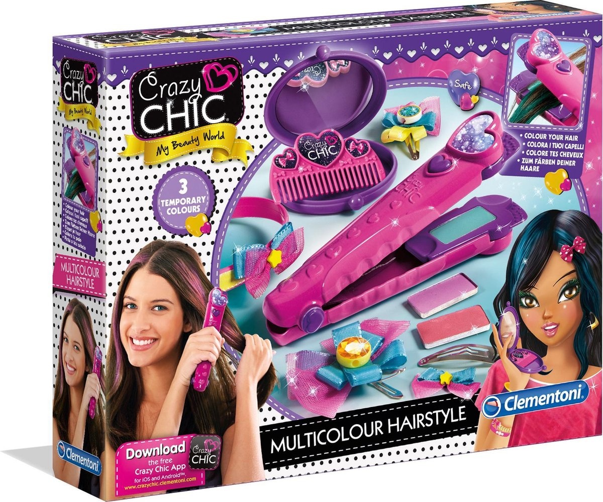 Meisjes kunnen de mooiste kleurschakeringen en regenbooglokken in hun haar creëren: doe hiervoor gewoon een tablet gekleurd poeder in de houder, steek een haarlok in de stijltang en de kleur wordt aan je haar afgegeven voor een perfect resultaat! Inclusief een kam, spiegeltje en kleurrijke haaraccessoires voor een echte Crazy Girl look!