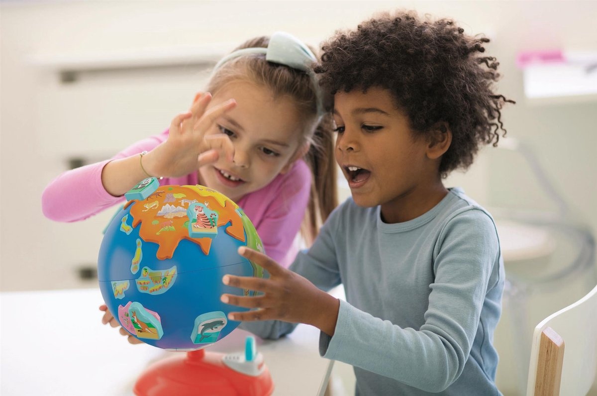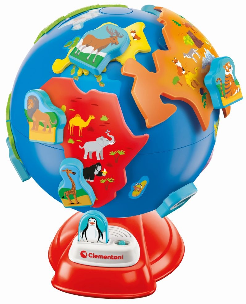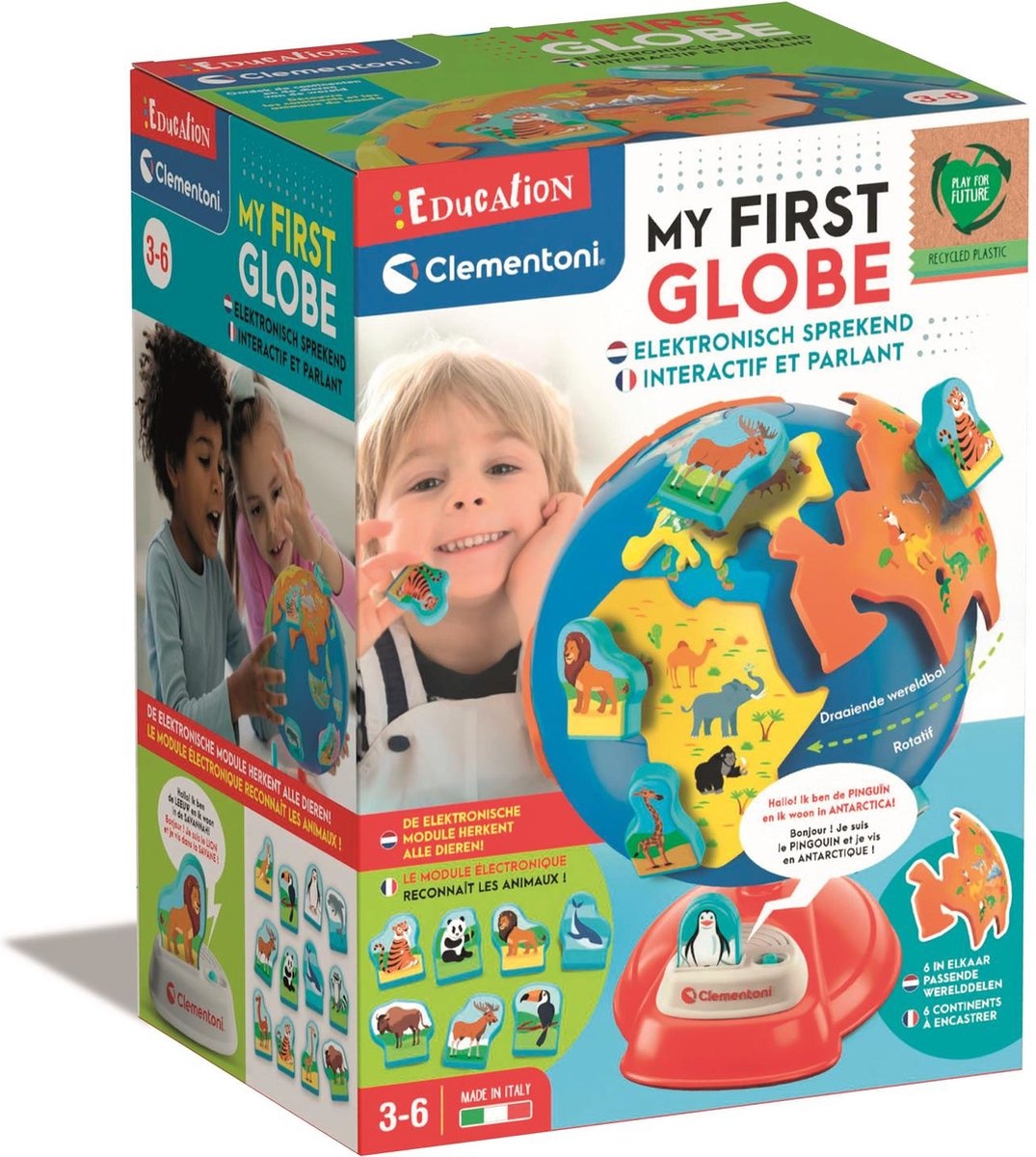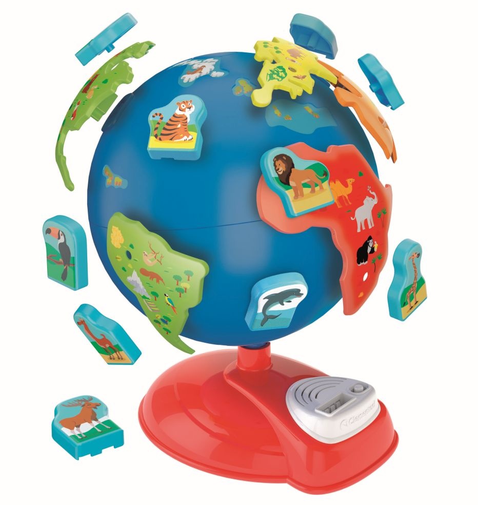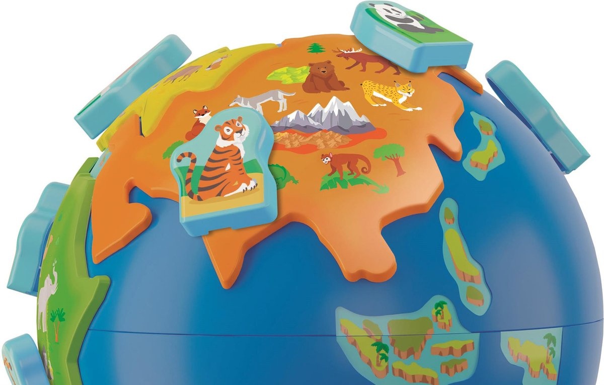 Met de Educatieve Wereldbol zet je kind zijn of haar eerste stappen in de wereld van aardrijkskunde! Je kind plaatst uitsnedes van verschillende werelddelen en dieren in de grote elektronische wereldbol. Steken ze een van de dieren in de gleuf op de vo
