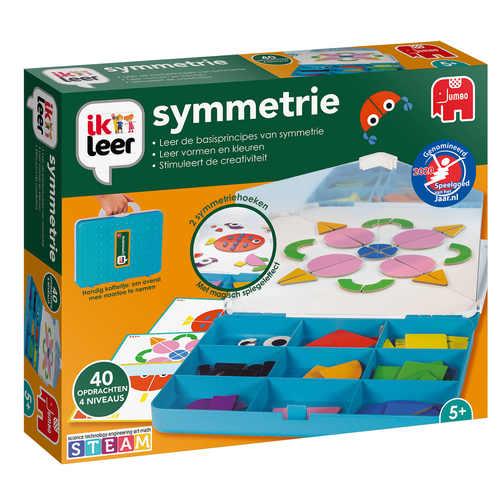 Met ‘Ik leer symmetrie’ leren kinderen spelenderwijs de basisprincipes van symmetrie. Door de vormpjes op de juiste manier te leggen en het magische effect van de spiegel te ontdekken, leren ze figuren en kleuren te herkennen en wordt hun creativiteit gestimuleerd. De oplossing staat aan de achterzijde van de kaart, zodat de kinderen zelfstandig kunnen spelen en leren.