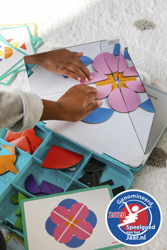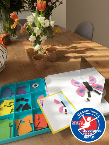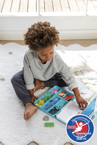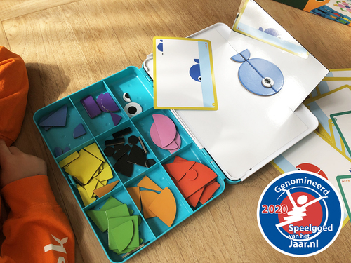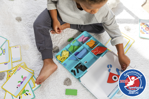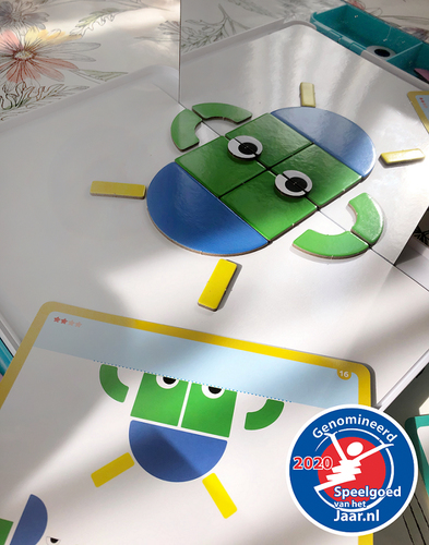 Spelenderwijs de basisprincipes van symmetrie leren. Maak de afbeelding na die je op de kaart ziet, door de vormpjes op de juiste manier neer te leggen. Ontdek het magische effect van de spiegel en zie hoe de volledige figuur verschijnt. De oplossing staat aan de achterzijde van de kaart, zodat de kinderen zelfstandig kunnen spelen en leren. Het spel bevat 40 kaarten met opdrachten op 4 niveaus. Alles netjes opgeborgen in een handige koffer.