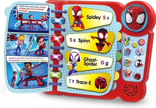Leer samen met Spidey letters en woorden. Druk op de knipperende toetsen om verhaaltjes te horen, vragen te beantwoorden of om te drummen met Gwen! Verken de 14 geïllustreerde bladzijden en ontdek grappige geluiden, vrolijke zinnetjes en melodietjes. Het