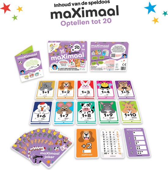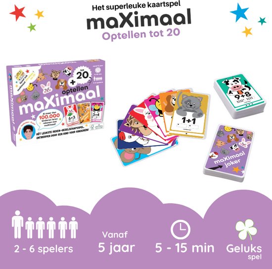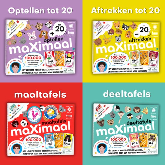 “Hallo, ik ben Maxim (8 jaar)! Om het optellen tot 20 makkelijker aan te leren, heb ik een geweldig gezelschapsspel bedacht: maXimaal Optellen tot 20! Zo kan je optellen tot 20 al spelend leren thuis, op reis, tijdens vakanties, én zelfs op school! Op de kaarten staan ook getalbeelden. Zo leer je de cijfers herkennen en sneller rekenen.