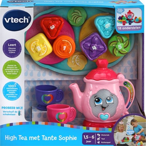 Wie o wie heeft er zin in een high tea? Speel de allerleukste rollenspellen met tante Sophie tijdens 3 uitdagende speelstanden. Kantel de theepot, open en sluit de deksel, druk op de hart-toets en leer o.a. kleuren, vormen en tellen. Luister naar de vrolijke zinnetjes en gezongen liedjes terwijl je de allerlekkerste thee maakt en de cakejes versiert. Tijd voor thee en lekkers!