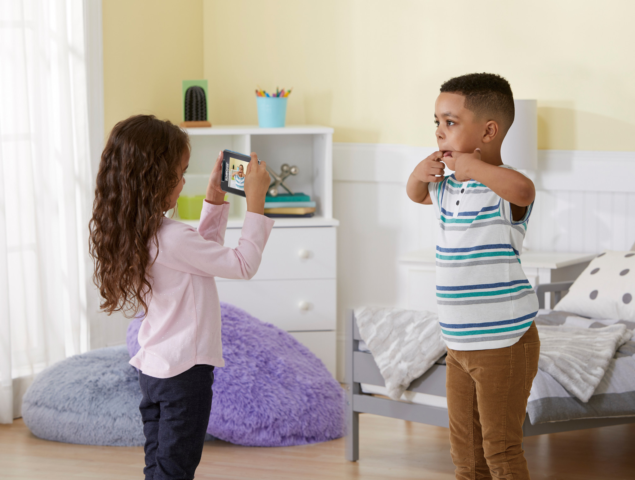 Een supercoole gadget met eindeloze mogelijkheden voor kinderen! Speel spellen, luister naar je favoriete muziek, bekijk video’s, maak tekeningen en de coolste foto’s en video’s met de 180o draaibare cameralens met macro-functie. Gebruik de KidiCom Chat a