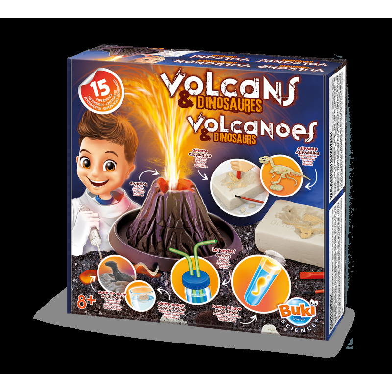 Met deze Buki set Vulkanen en Dinosaurussen 15 experimenten leer je alles van vulkanen en dinosaurussen: reproduceren van een vulkaanuitbarsting thuis, merkt de vulkanische rotsen, realiseert een lavalamp en
