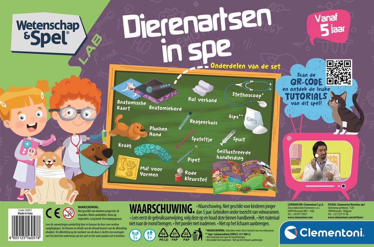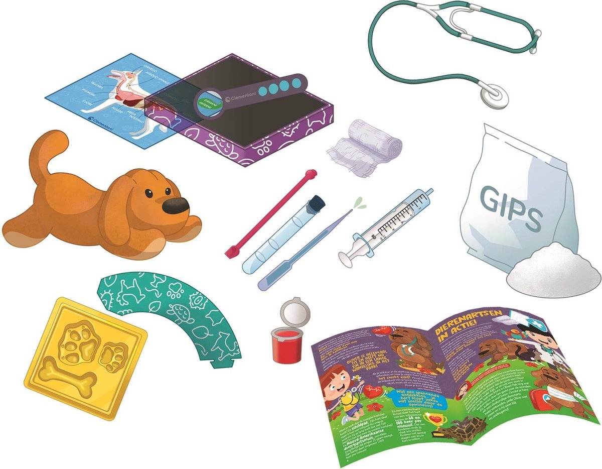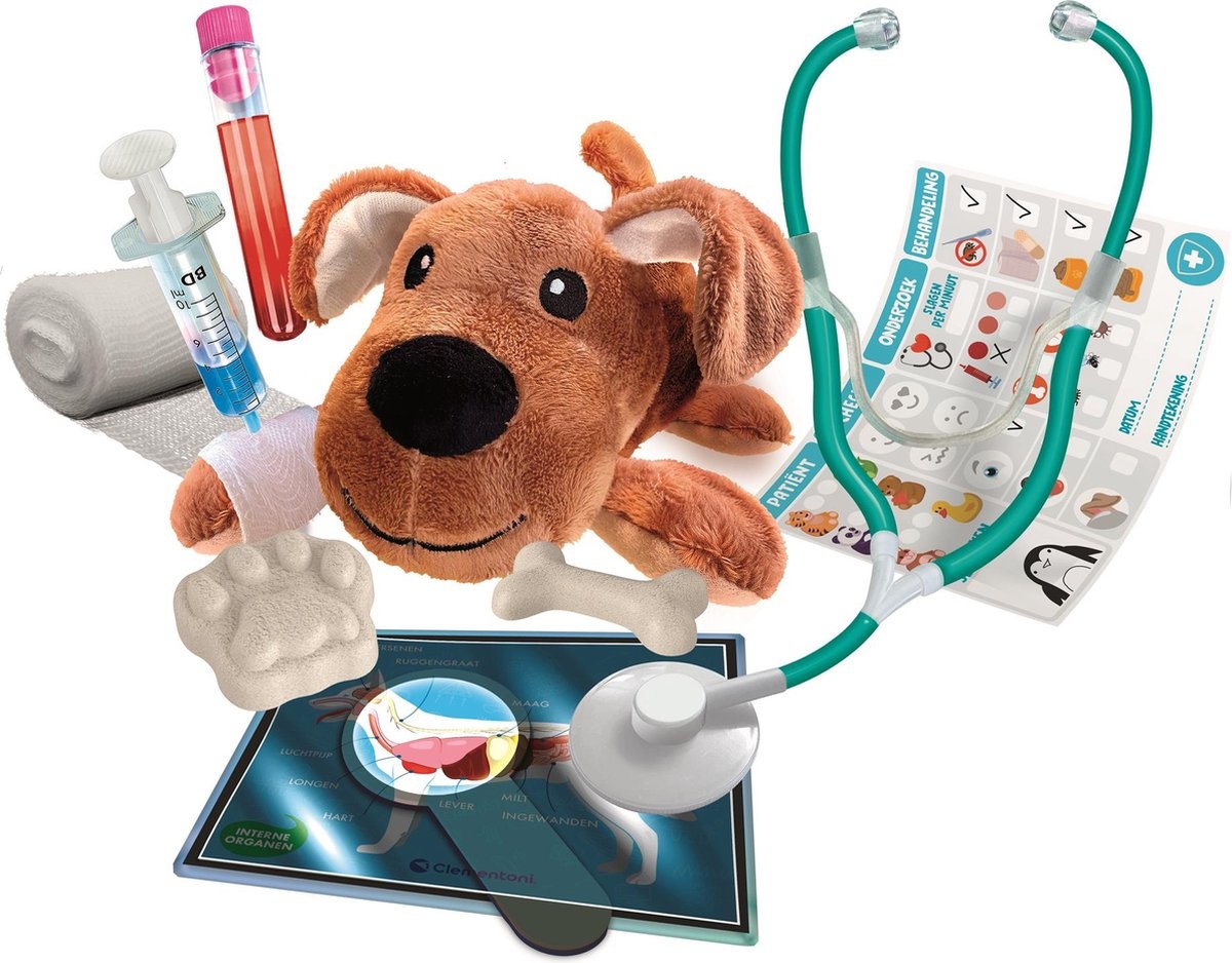 Wil jouw kind later dierenarts worden? Deze wetenschappelijke set leert kinderen om zieke dieren te helpen! Het knuffeldiertje in de set is ziek. Maakt jouw kind hem beter met verband, gaas en een heuse stethoscoop?
