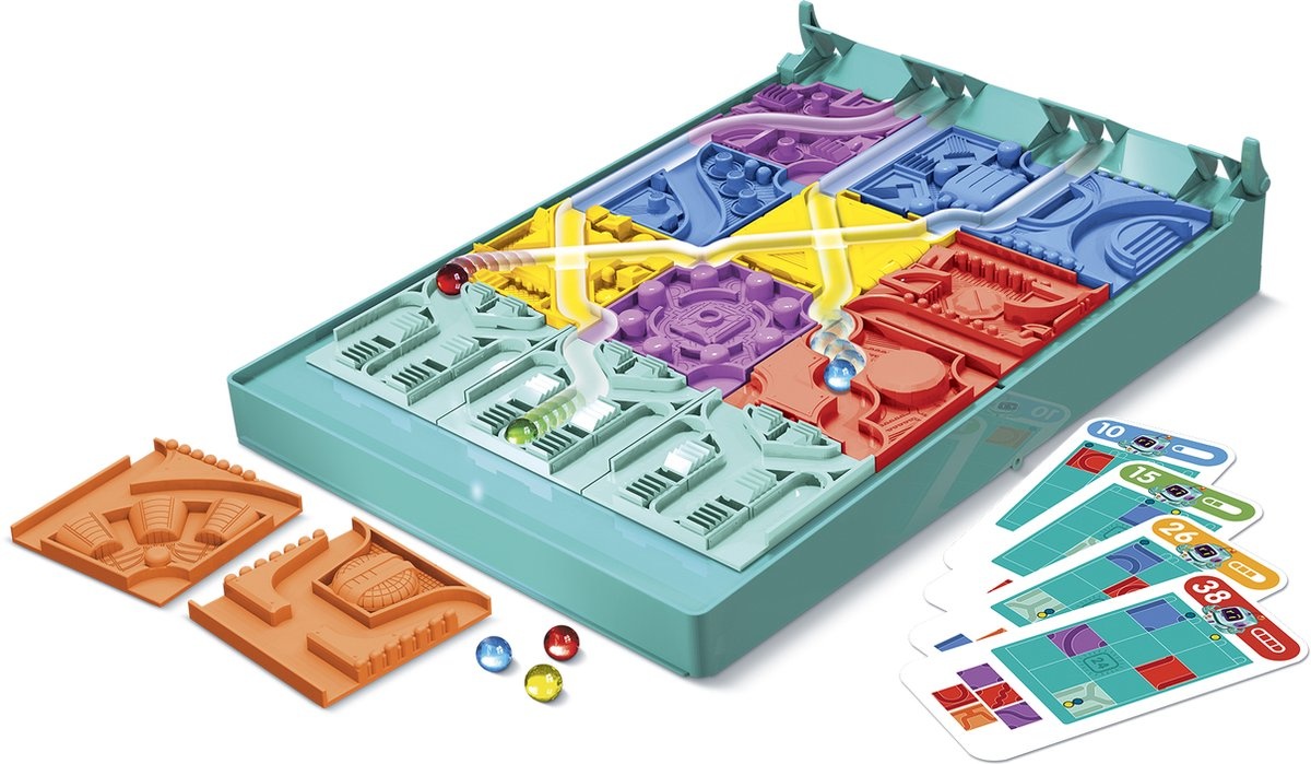 Componenten : 1 spelregelboek, 1 speelbord met lade, 16 stadsblokken, 40 puzzelkaarten, 8 knikkers.